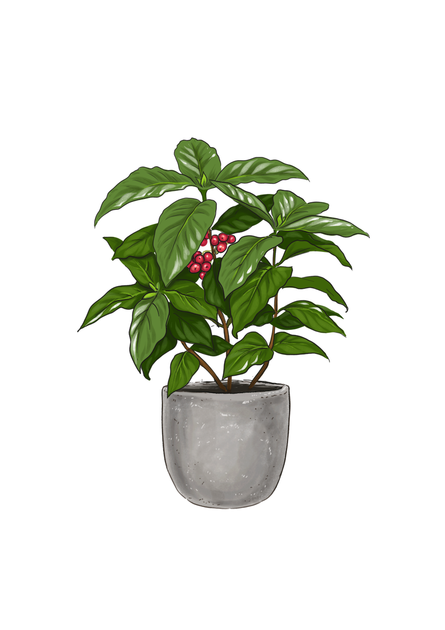 When receiving the Coffee Plant, do not repot immediately but wait at least 6-12 months or if the roots are beginning to get crowded and growing through the drainage holes. Repot in the spring, using a 2 inches bigger pot to keep the roots drier. (Too big of a planter could cause the soil to dry slower.) Place a piece of screening at the bottom of the container over the drainage hole to secure the soil and allow to drain. Use a well-draining indoor potting mix with perlite to help with drainage. Water your plant in the old pot before transferring over and let them sit an hour. Add rich potting soil to the bottom to elevate the root ball. Lift the plant and release the roots against the existing planter. Use a clean knife or garden trowel to wedge between the pot and the soil to loosen. Inspect the root ball. Notice if there are any dead or rotting roots and trim off with sterile pruners. If the plant is rootbound, cut through the roots to alleviate continued encircling. Ensure the plant is sitting about 1 inch below the edge of the pot to avoid water spillage. Add more soil and backfill around the sides by tamping down. Fill up to the soil line but not over. Water thoroughly, leaving the soil damp but not soggy. If settling occurs, add more soil. Water well to dampen the soil and let drain.