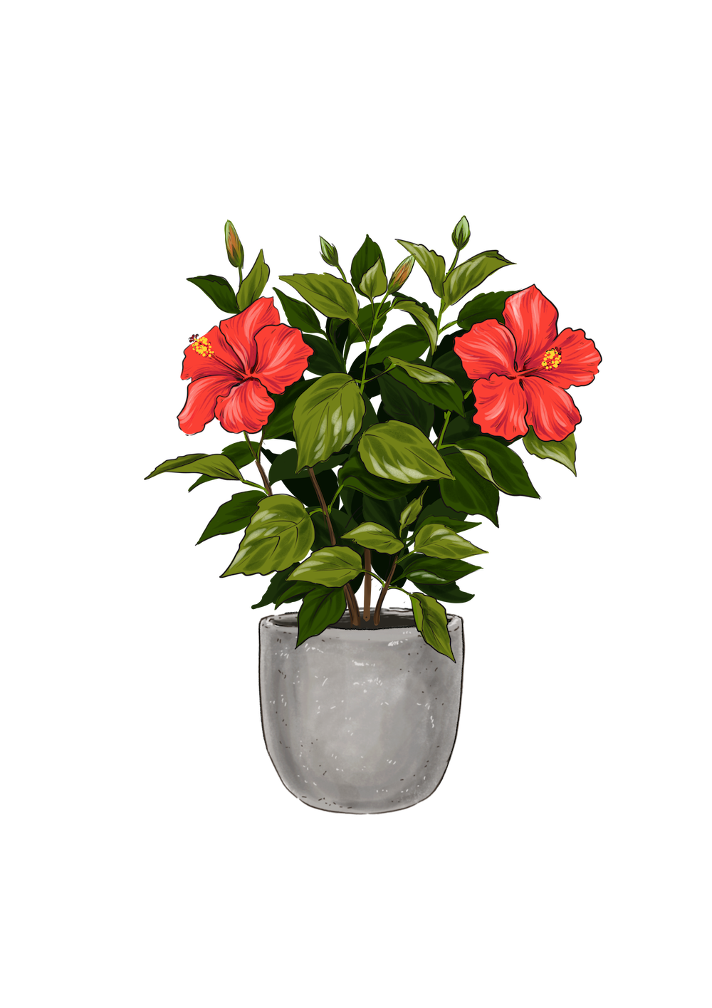 Container: When the plant is rootbound or there is dieback on their growth, they are ready to repot (early spring before growth starts), plant in a 2" bigger container in diameter and slightly deeper than the existing planter. Use an indoor container mix that is well-draining. Add soil to the bottom to elevate the root ball. Lift the plant and inspect the root ball. Notice if there are any dead or rotting roots and trim them off with sterile pruners. If the plant is rootbound, cut through the roots to alleviate continued encircling. Ensure the plant is sitting about 1" below the edge of the pot to avoid water spillage. Add more soil and backfill around the sides by tamping down. Do not cover the current level of soil on the plant but add soil up to this level. Water thoroughly, leaving the soil damp but not soggy. Add more soil after watering if the soil settles. Outdoors: Before planting the Hibiscus into the ground, water the plant in the grower pot well. Find a spot in the garden where there are at least 6 hours of direct sunlight each day. Be generous by digging a hole twice the pot's width and 1 inch shorter than the grower pot to raise it above the soil level for good drainage. Use a pitchfork or a sharp object to stab the soil walls to make several indentions for the roots to take hold. Tickle the roots to loosen them if they wrap inside the container. Place the plant in the center of the hole. Fill the hole with water first, so the roots get another good drink. Next, backfill with native soil mixed with compost by one-third to one-half (if the native soil is clay). Add a rooting hormone fertilizer to this backfill mixture. Tamp the soil firmly down around the edges and mound up. Avoid covering the original soil level of the plant that was in the container. Add mulch as needed but not next to the stem or branches of the plant. Water lightly. Continue to observe the soil moisture each day, depending on the temperatures and soil drainage.