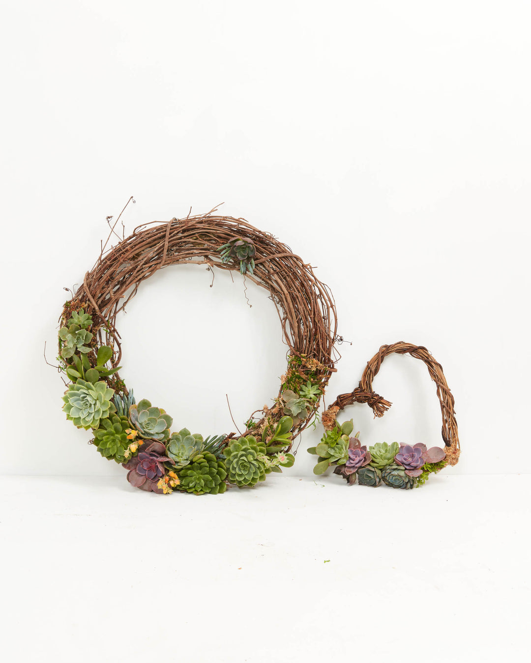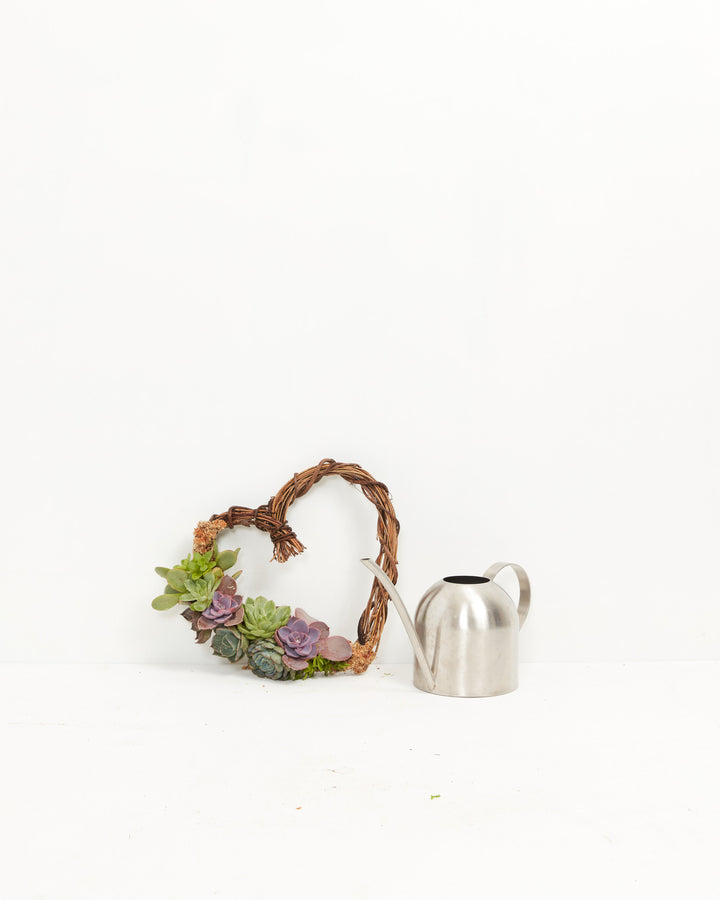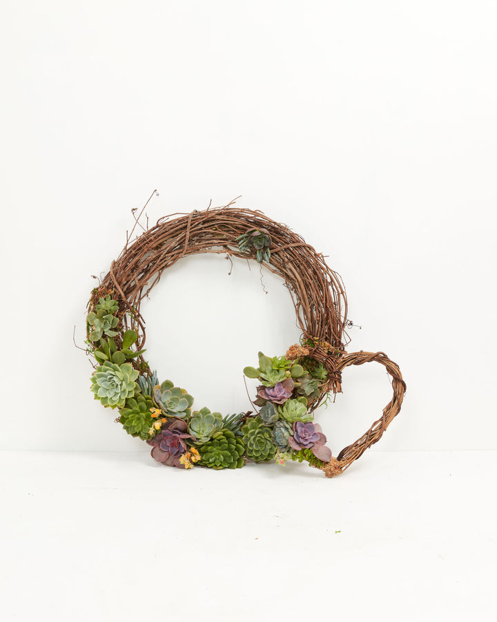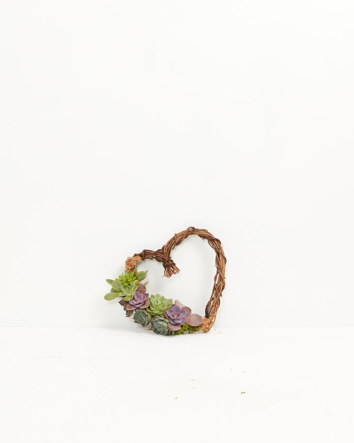 This heart succulent wreath is 9” or 12" in diameter and is a partially covered wreath - with mixed succulent rosettes and moss.