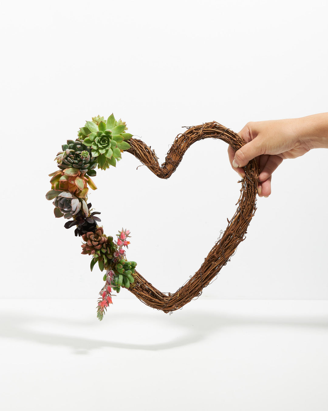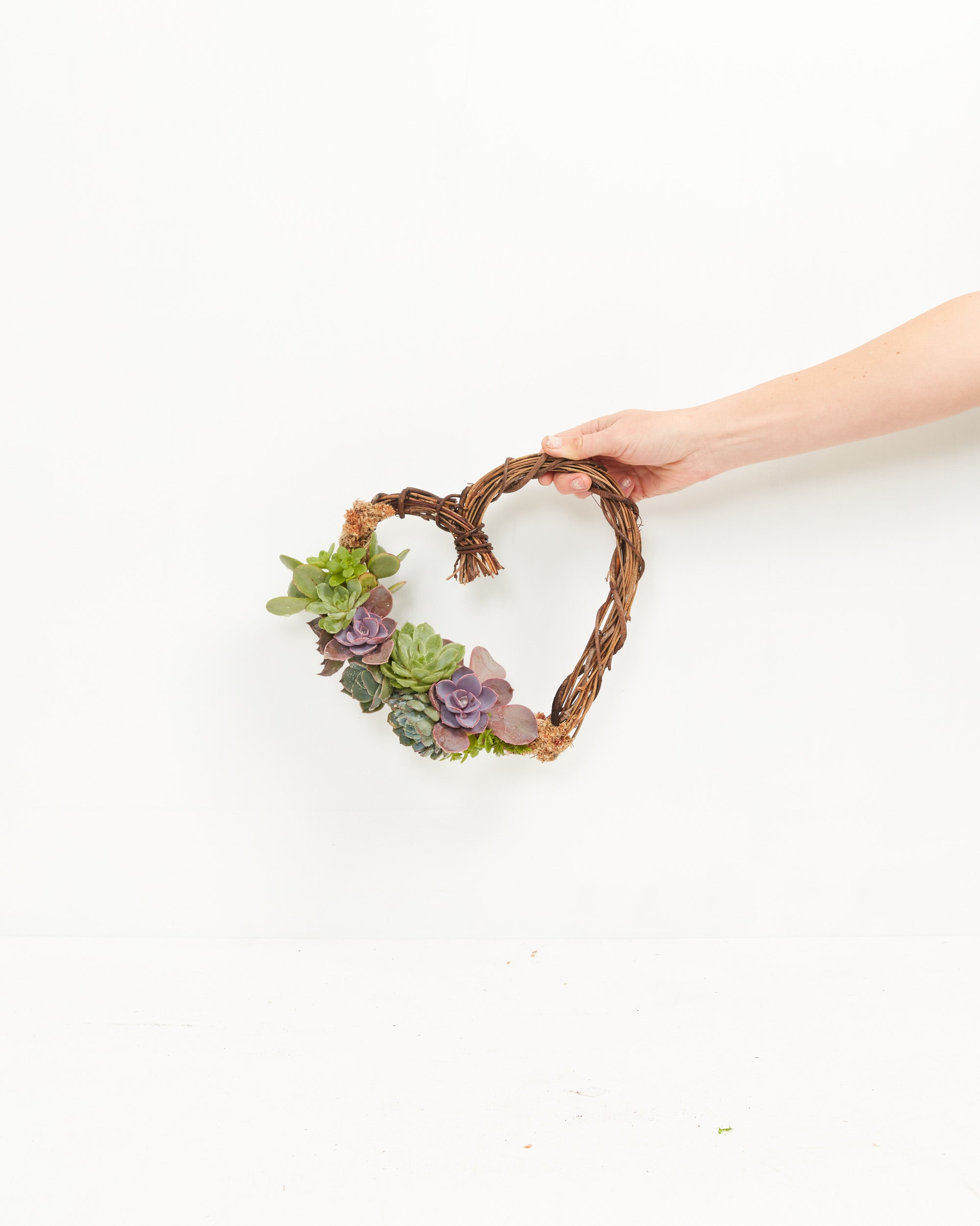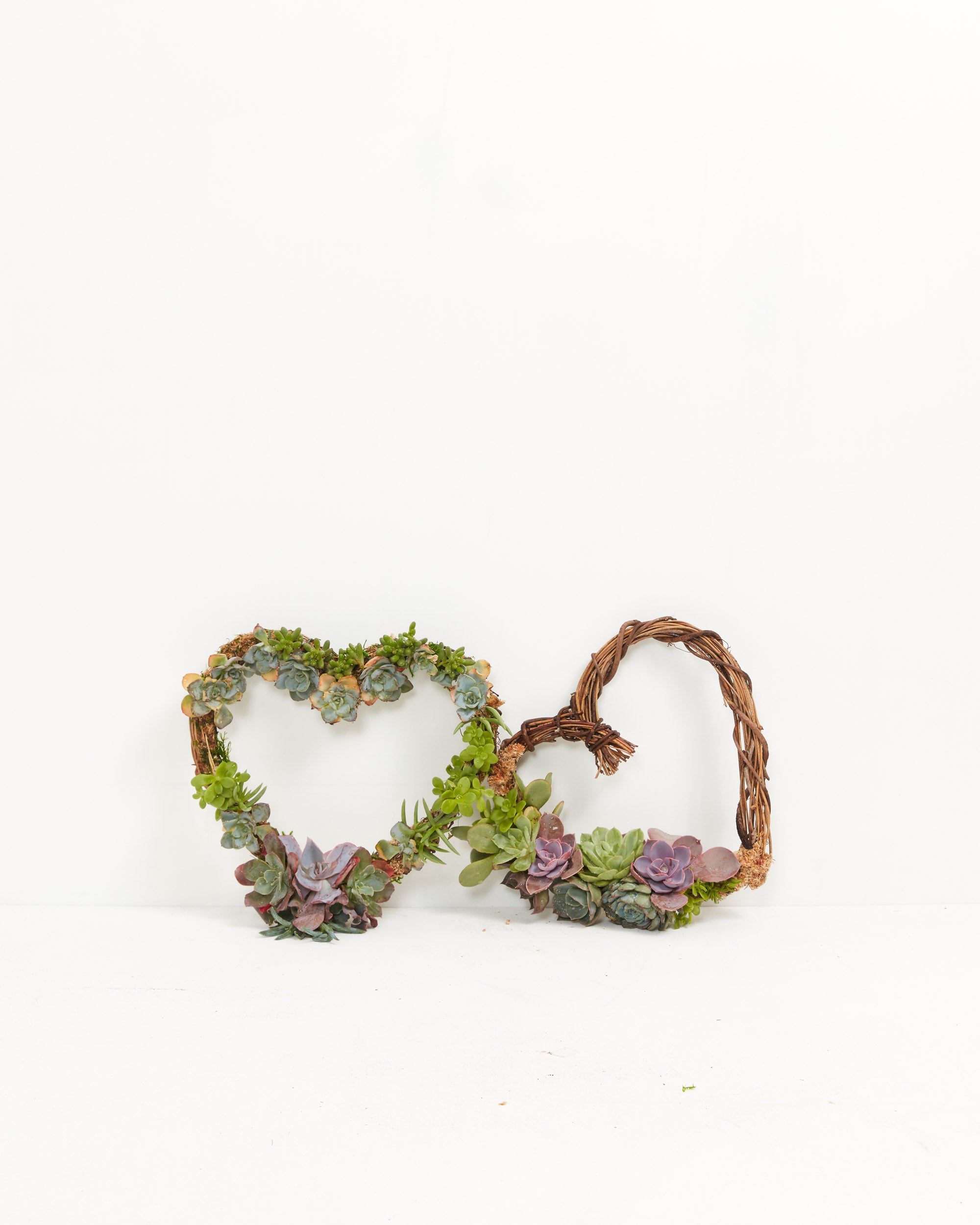 This heart succulent wreath is 9” or 12" in diameter and is a partially covered wreath - with mixed succulent rosettes and moss.