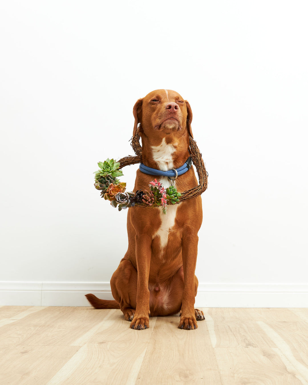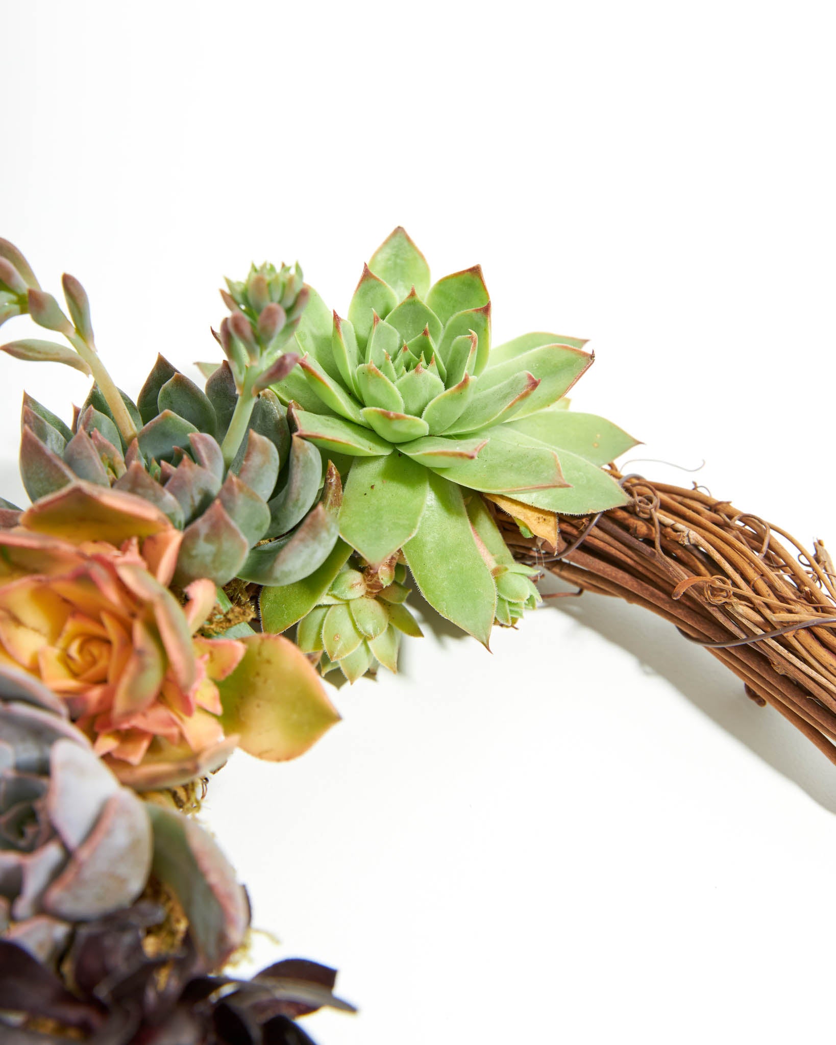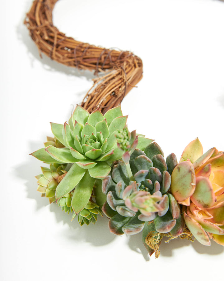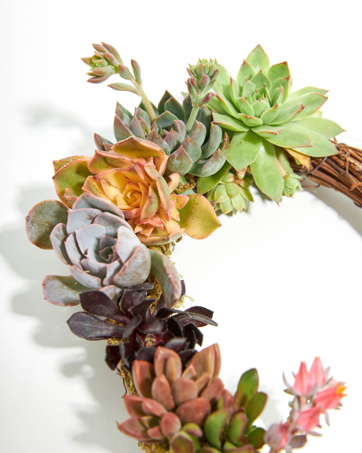 This wreath is hand-made and can be either hung or used as a table centerpiece. We start with a grapevine wreath and add moss and quality succulent rosettes that are grown in Southern California.