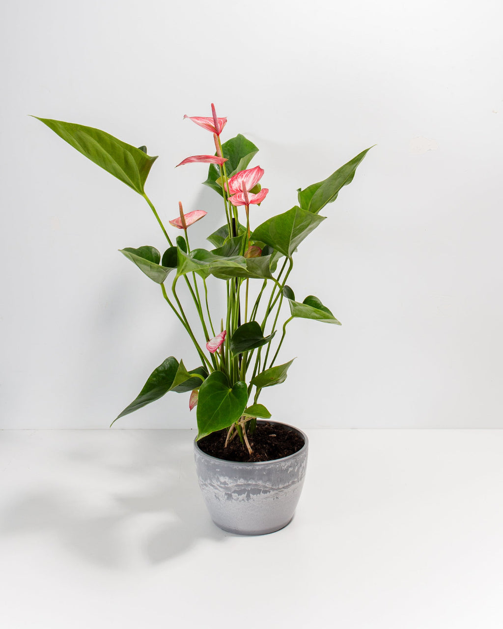 Fertilize your plant monthly with a balanced liquid fertilizer during the growing season, letting it rest in winter when it goes dormant. In some cases, flushing your plant’s soil may be necessary to remove fertilizer salt buildup (salts can form a white residue on the soil and the pot). You can propagate your Anthurium plant by dividing it in spring or during repotting.