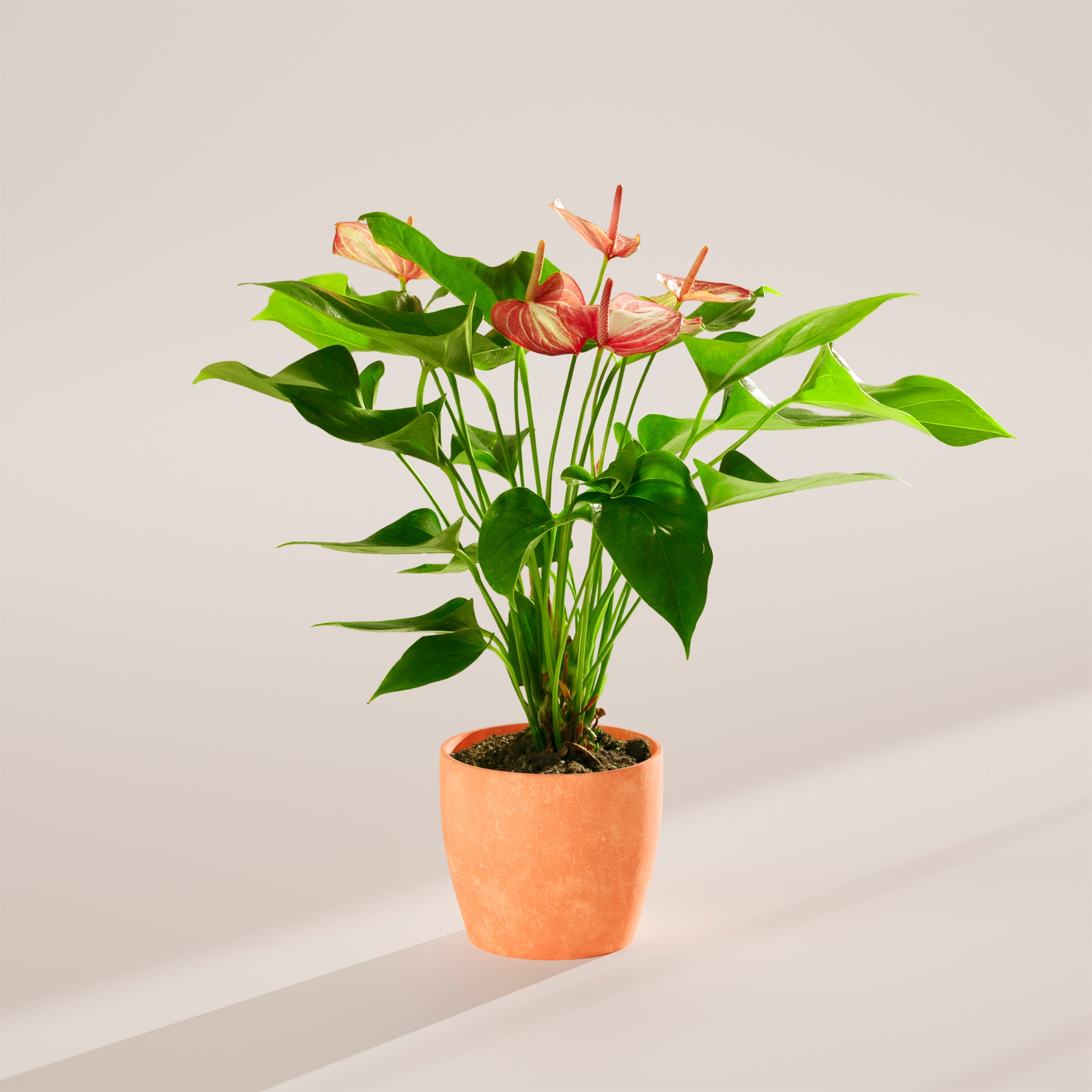 Fertilize your plant monthly with a balanced liquid fertilizer during the growing season, letting it rest in winter when it goes dormant. In some cases, flushing your plant’s soil may be necessary to remove fertilizer salt buildup (salts can form a white residue on the soil and the pot). You can propagate your Anthurium plant by dividing it in spring or during repotting.