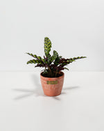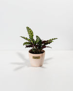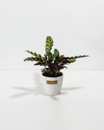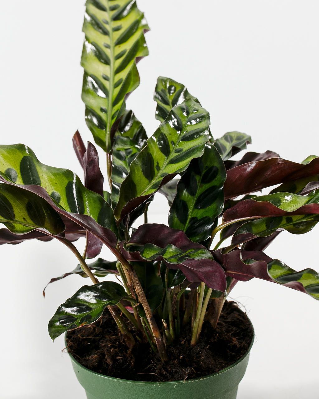 The Rattlesnake Plant (Calathea lancifolia) is one you'll kick up your boots over! Calathea Rattlesnake boasts striking and distinctive markings of limelight green with darker brush strokes seemingly painted onto the leaf. Once evening comes and dusk is near, the leaves stand straight up to reveal the hidden burgundy leaf underside. It's like having two plants in one!