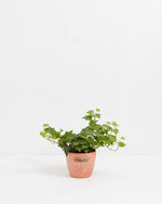 California ivy is a part of the ivy climbing plant family in many different climates. This ivy features green leaves, each with five rounded lobes, and the veins of each leaf are a lighter green color, and the stems occasionally have a reddish color. California Ivy produces small pink flowers in the springtime, and the summer produces really fun small red berries. This plant is great for new plant parents as they require low upkeep. Because they can grow so rapidly, California ivies need to be fed at least once a month and require only minimal watering.