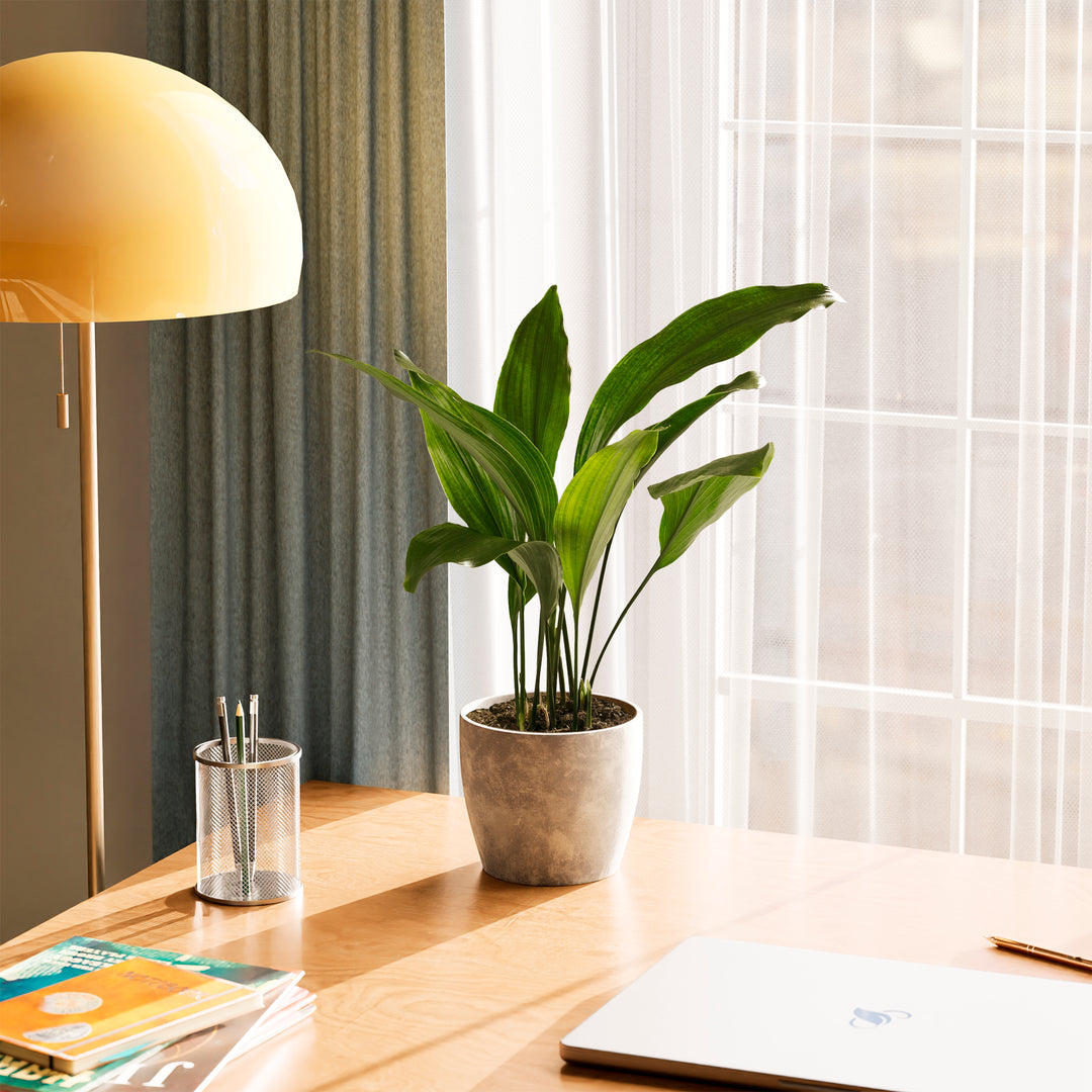The Cast Iron Plant can thrive in low to medium light conditions. It is perfect for dimly lit rooms or offices, but it can also adapt to brighter, indirect light. Avoid direct sunlight, as it can scorch the leaves.