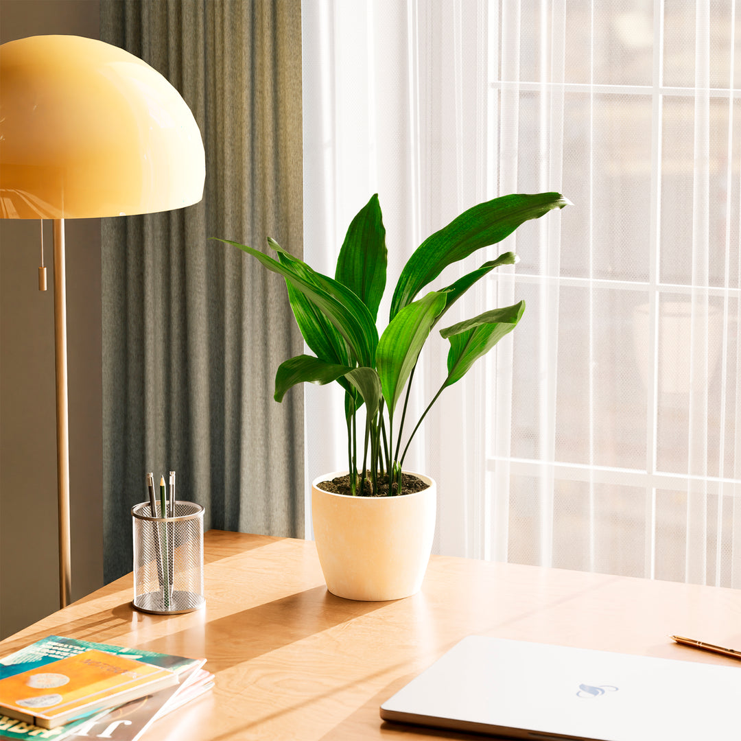 The Cast Iron Plant can thrive in low to medium light conditions. It is perfect for dimly lit rooms or offices, but it can also adapt to brighter, indirect light. Avoid direct sunlight, as it can scorch the leaves.