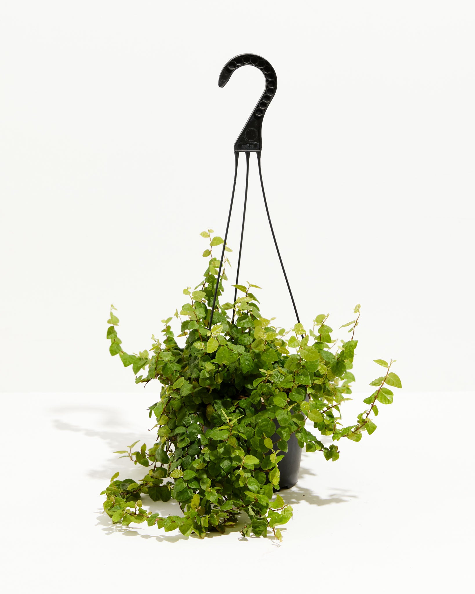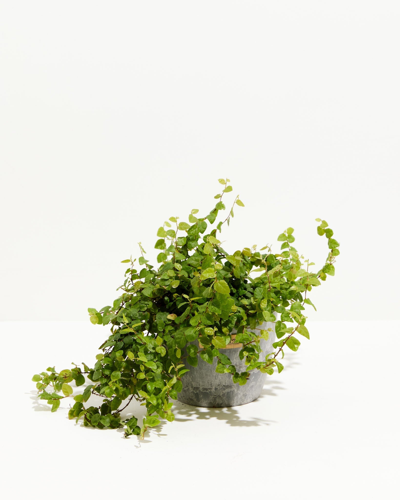 Creeping fig vines like to be a bit rootbound, so wait and go bigger every 2-3 years. When repotting in the spring, use a 2" bigger pot to keep the roots drier. (Too big of a pot could cause the soil to dry slower, which is not helpful.) Use a well-draining indoor potting mix with perlite to help with drainage. Water your plant in the old pot before transferring over and let it sit for an hour. Place a piece of screening at the bottom of the container over the drainage hole to secure the soil and allow it to drain. Add soil to the bottom to elevate the root ball. Lift the plant and release the roots against the existing planter. Use a clean knife or garden trowel to wedge between the pot and the soil to loosen. Inspect the root ball. Notice if there are any dead or rotting roots and trim them off with sterile pruners. If the plant is rootbound, cut through the roots to alleviate continued encircling. Ensure the plant is sitting about 1" below the edge of the pot to avoid water spillage. Add more soil and backfill around the sides by tamping down. Fill up to the soil line but not over. Water thoroughly, leaving the soil damp but not soggy. If settling occurs, add more soil.