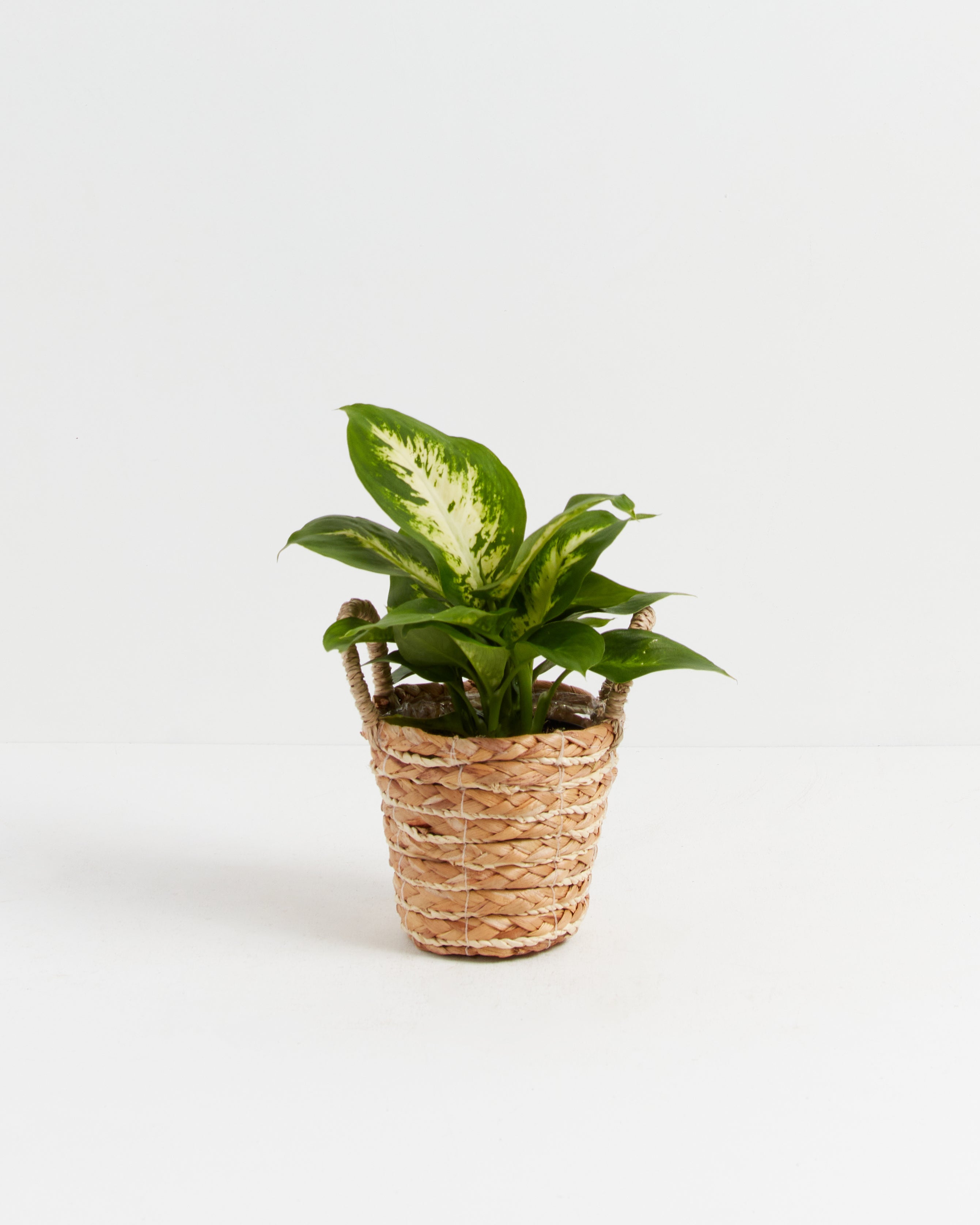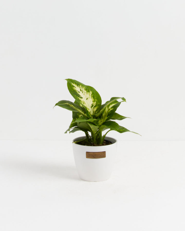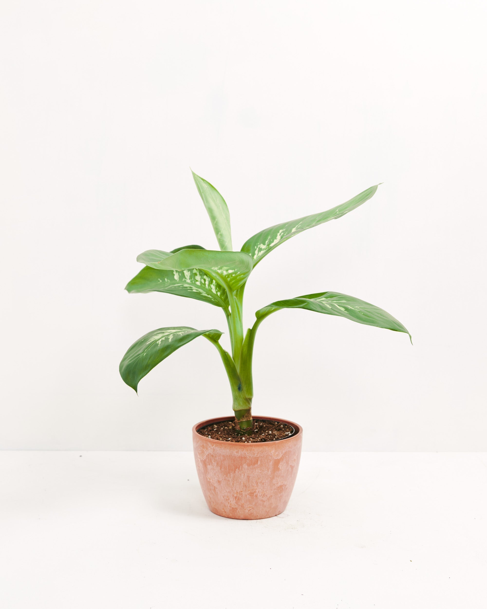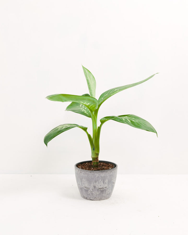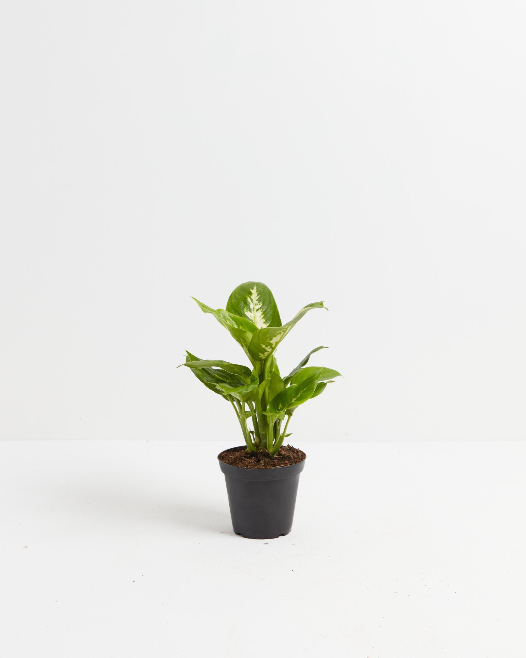 Dieffenbachia Carina (aka dumb cane) is a seriously popular houseplant. Their lush foliage is made up of large leaves in a vibrant medium green color, with variegated splotches in darker and lighter tones. They are super easy to care for, and just need an occasional spritz. Grow them in a pot, a hanging basket, or train them on a trellis.