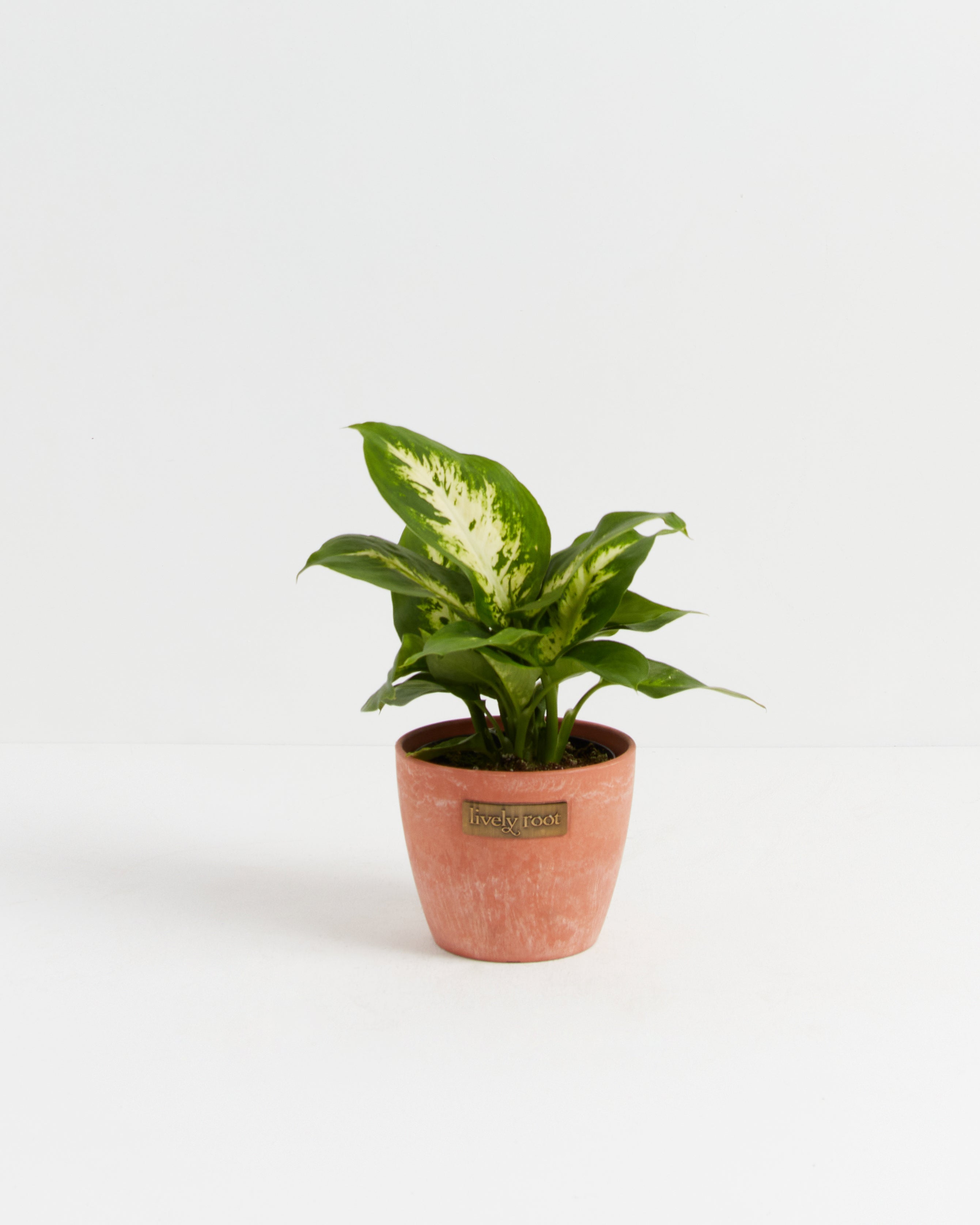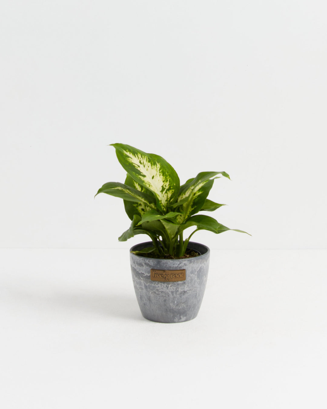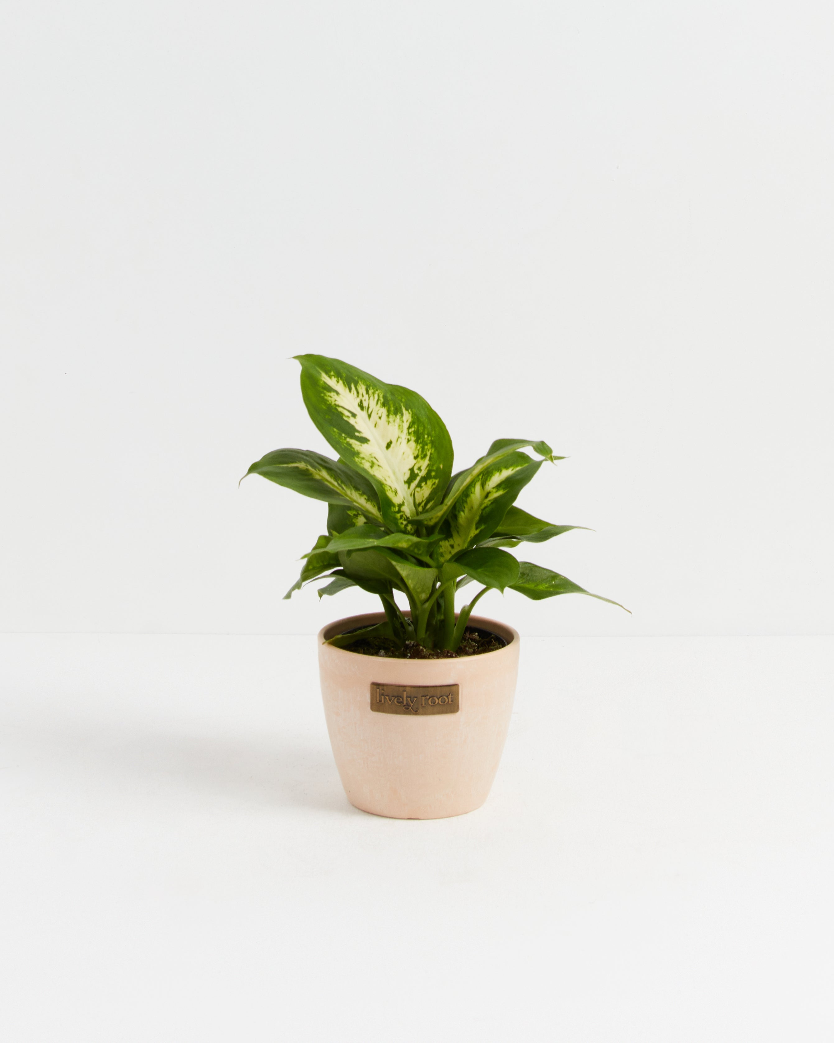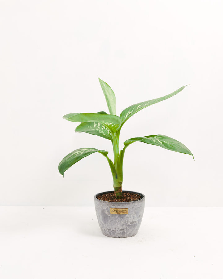 Dieffenbachia Carina (aka dumb cane) is a seriously popular houseplant. Their lush foliage is made up of large leaves in a vibrant medium green color, with variegated splotches in darker and lighter tones. They are super easy to care for, and just need an occasional spritz. Grow them in a pot, a hanging basket, or train them on a trellis.