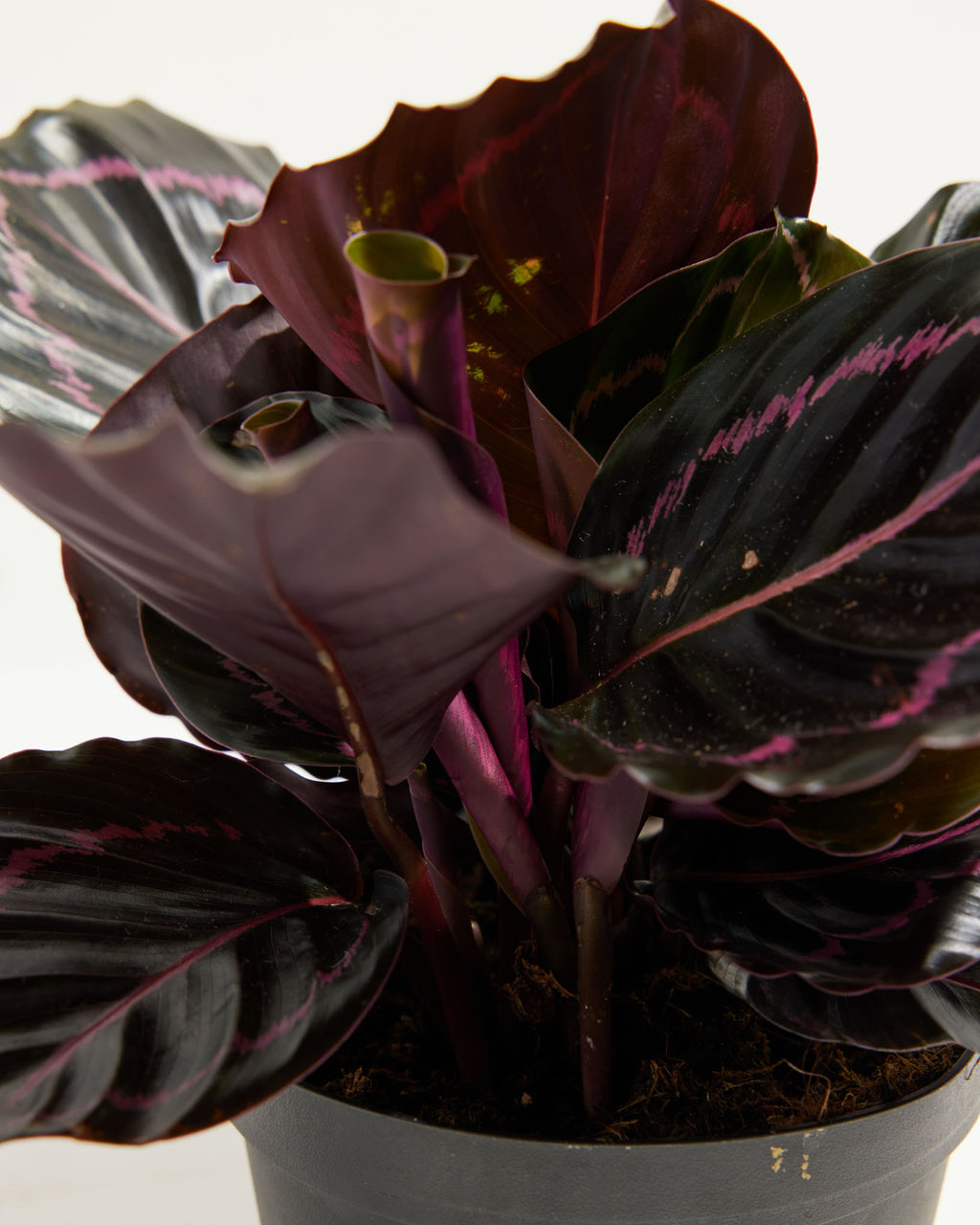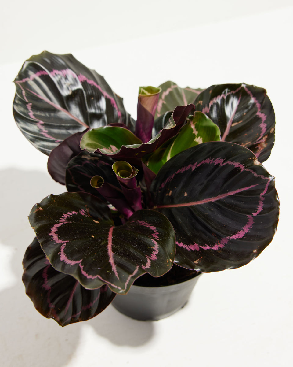Indoors: Propagate and divide Calathea plants in the early spring when emerging from dormancy. Pull from the container and brush or wash away the soil carefully. Carefully divide and repot in a rich, indoor potting soil mix or African violet mix. Use a container that has drainage and is deep enough for the roots to grow. Set it in medium to bright, indirect sunlight while they are rooting. Enclose the new plantings in clear plastic bags, mist and keep them in medium light. Remove the plastic bag when the roots are established. You may observe some leaf changes as it acclimates to its new environment. It may suffer some transplant shock depending on how tight the roots were intertwined together. Trim off any declining leaves as it regains its energy and gets rooted into the soil over time. Check the moisture and humidity each day and add misting to keep the soil moist while the roots establish. After 6-8 weeks, roots will begin to establish. You can tug onto the stem to ensure the roots are anchoring well. You can remove the clear plastic bag at this time but still maintain high humidity around the plant.