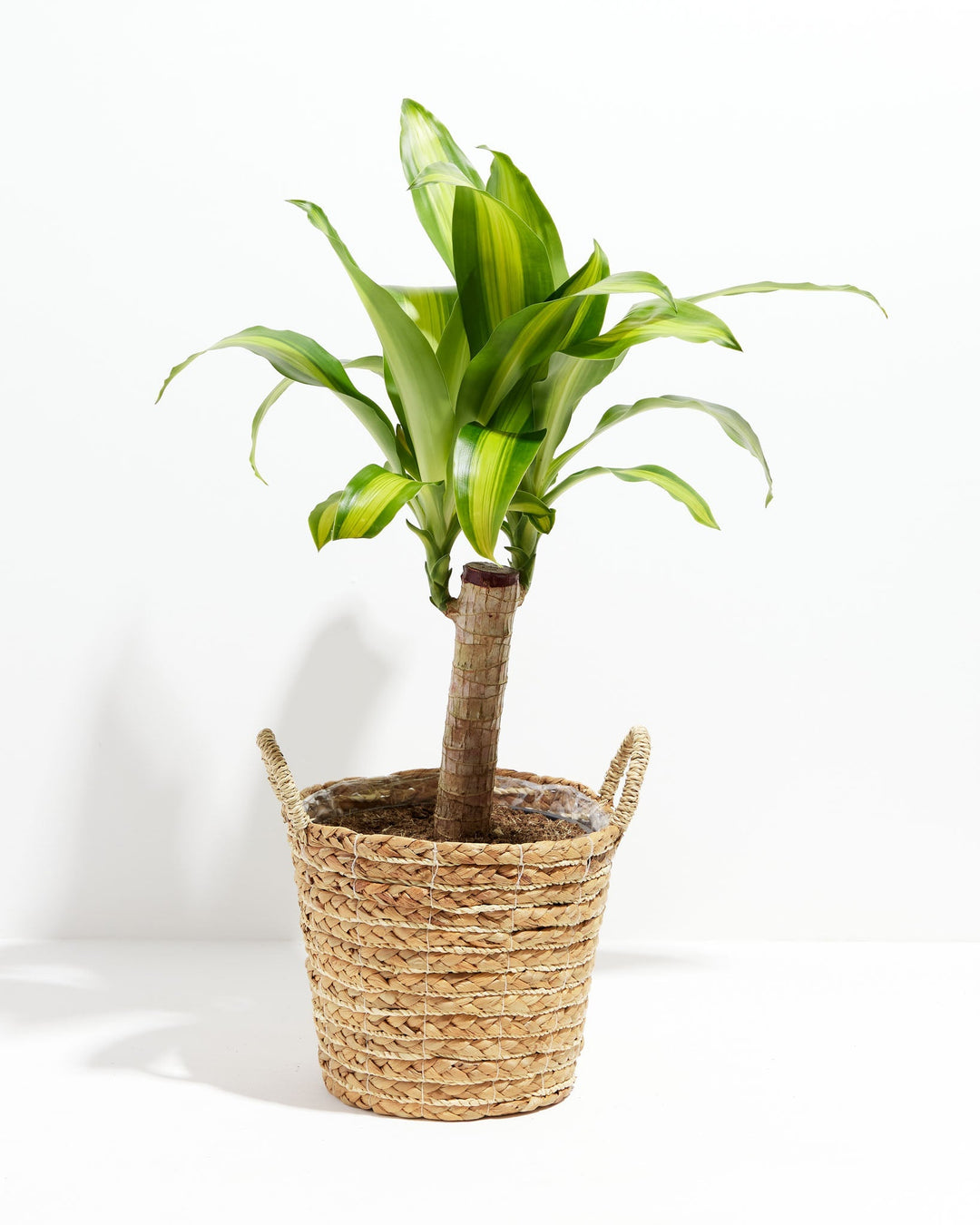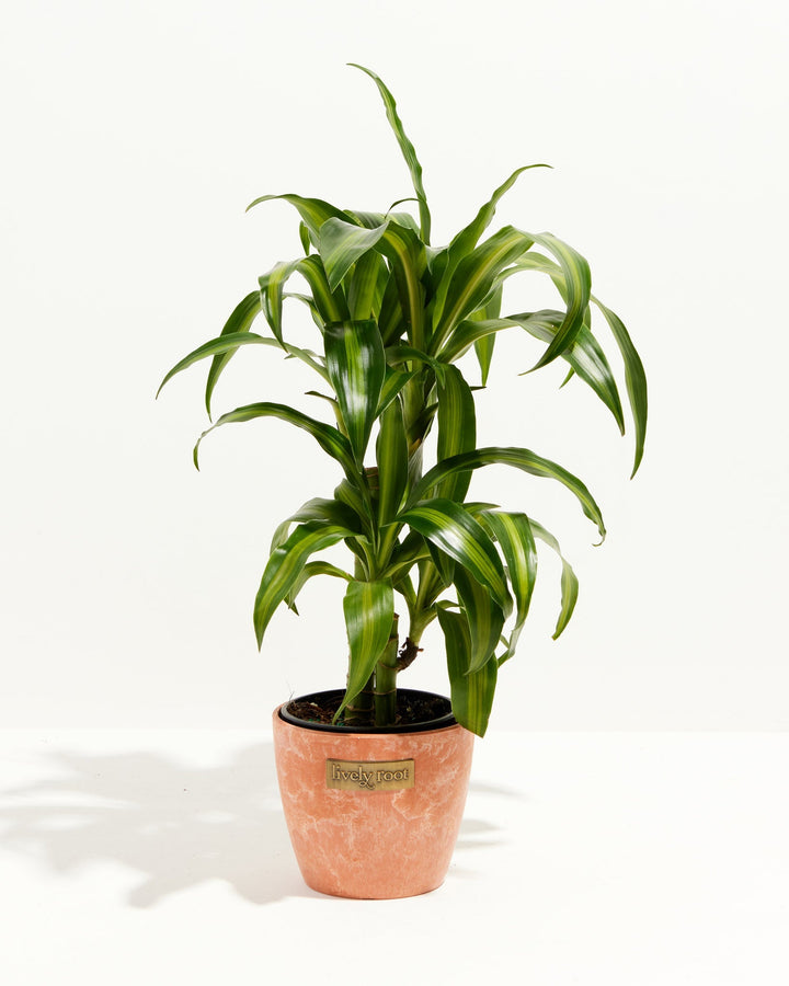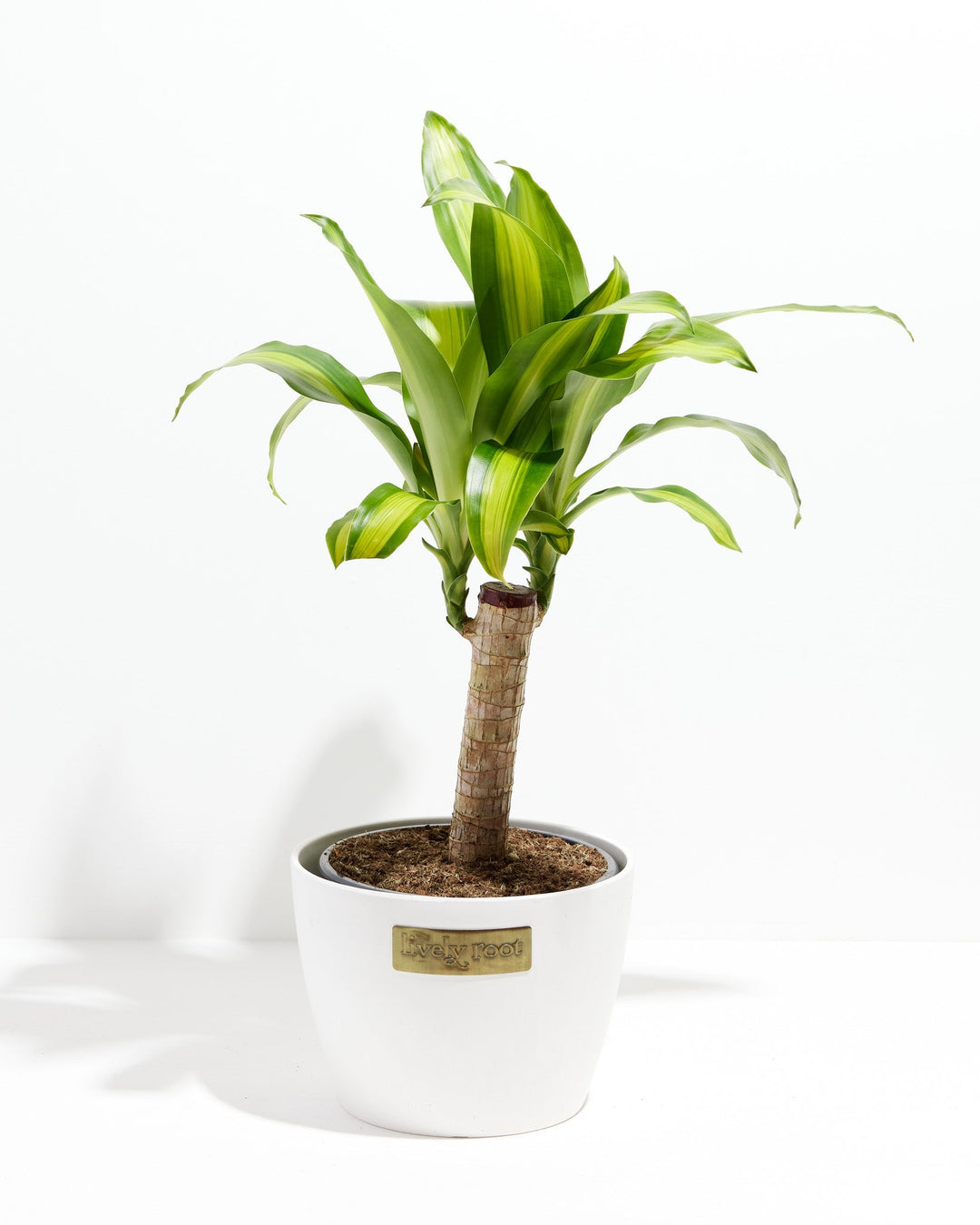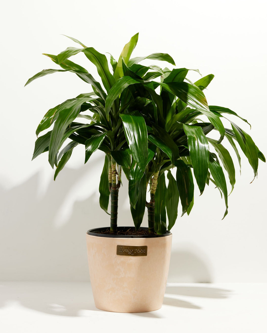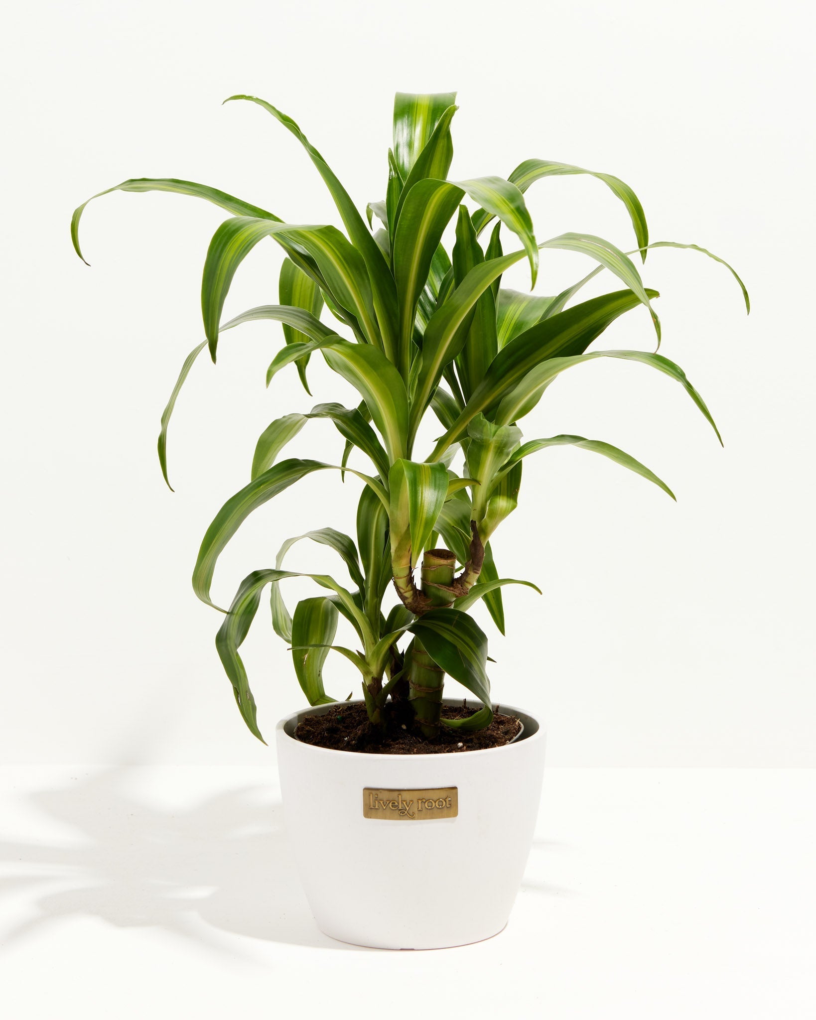 The Dracaena Massangeana Cane (Corn Plant) derives their common name for the upright growth and graceful, variegated leaves that resemble corn foliage. Their tall height fills up the air space to enjoy from below or from a balcony looking down. Their colorful striped foliage makes an attractive addition for roomy interiors with medium to bright light. Add humidity and keep moist (but not soggy) to give them optimum results.
