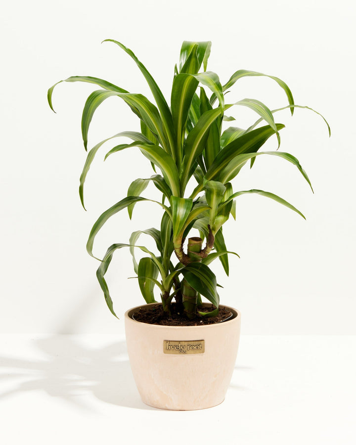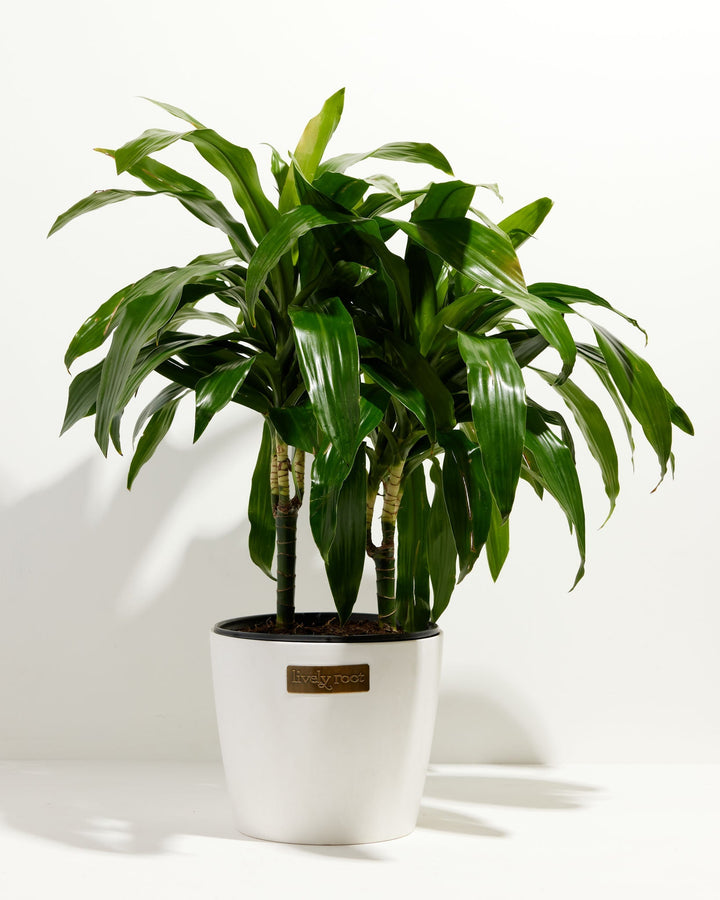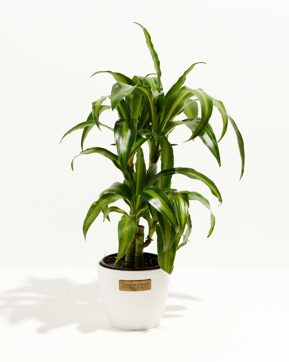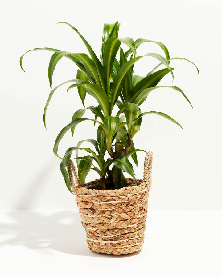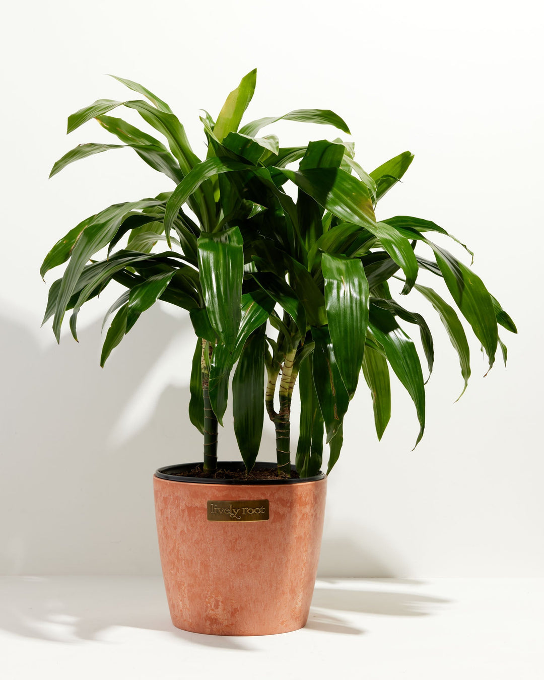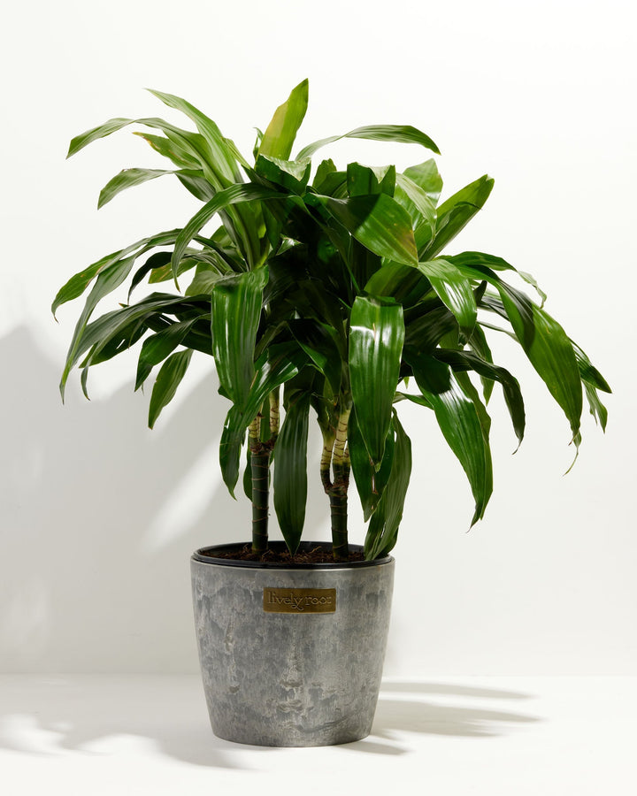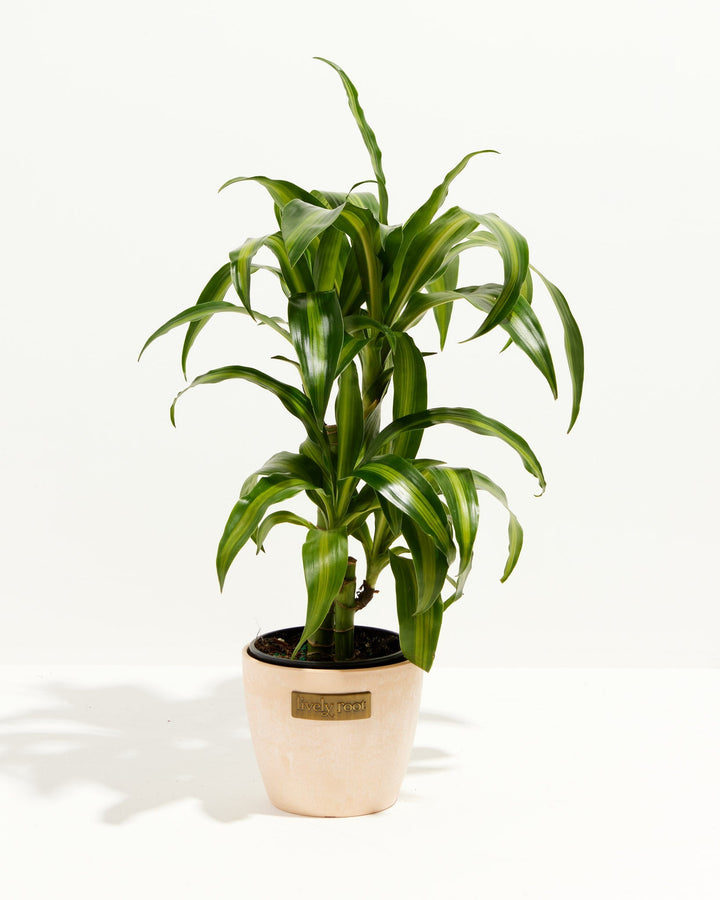 The Dracaena Massangeana Cane (Corn Plant) derives their common name for the upright growth and graceful, variegated leaves that resemble corn foliage. Their tall height fills up the air space to enjoy from below or from a balcony looking down. Their colorful striped foliage makes an attractive addition for roomy interiors with medium to bright light. Add humidity and keep moist (but not soggy) to give them optimum results.