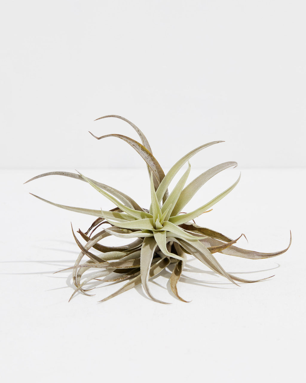 They are a very special air plant and great for beginners because they don't require as much humidity due to their abundance of trichomes (areas in their leaves that uptake water). The T. Harrisii air plants can grow beyond 8 inches tall, showing off their silvery-grey leaves in a rosette shape upwards along its stem. They showcase a rich red inflorescence to grow beautiful purple flowers. These are slow growers, so exercise a bit of patience and enjoy your other plant babies until they blossom. Keep this one in bright, indirect light and water once a week.