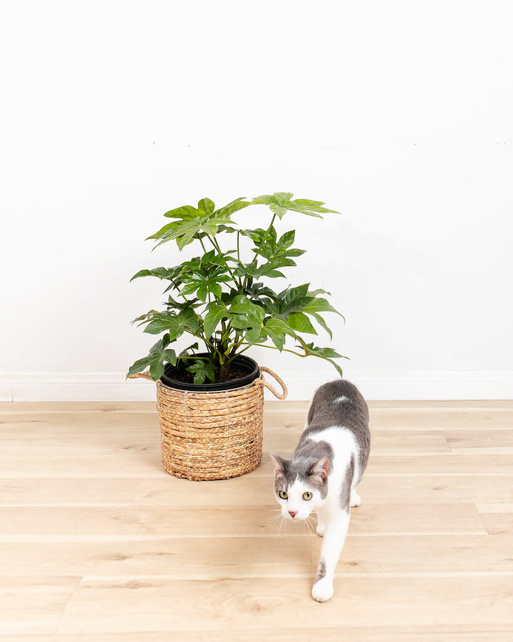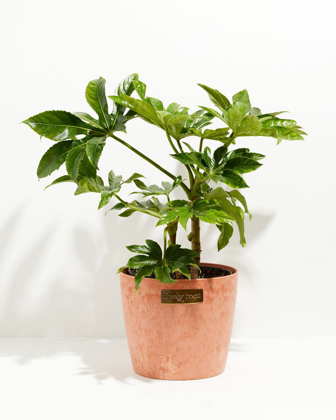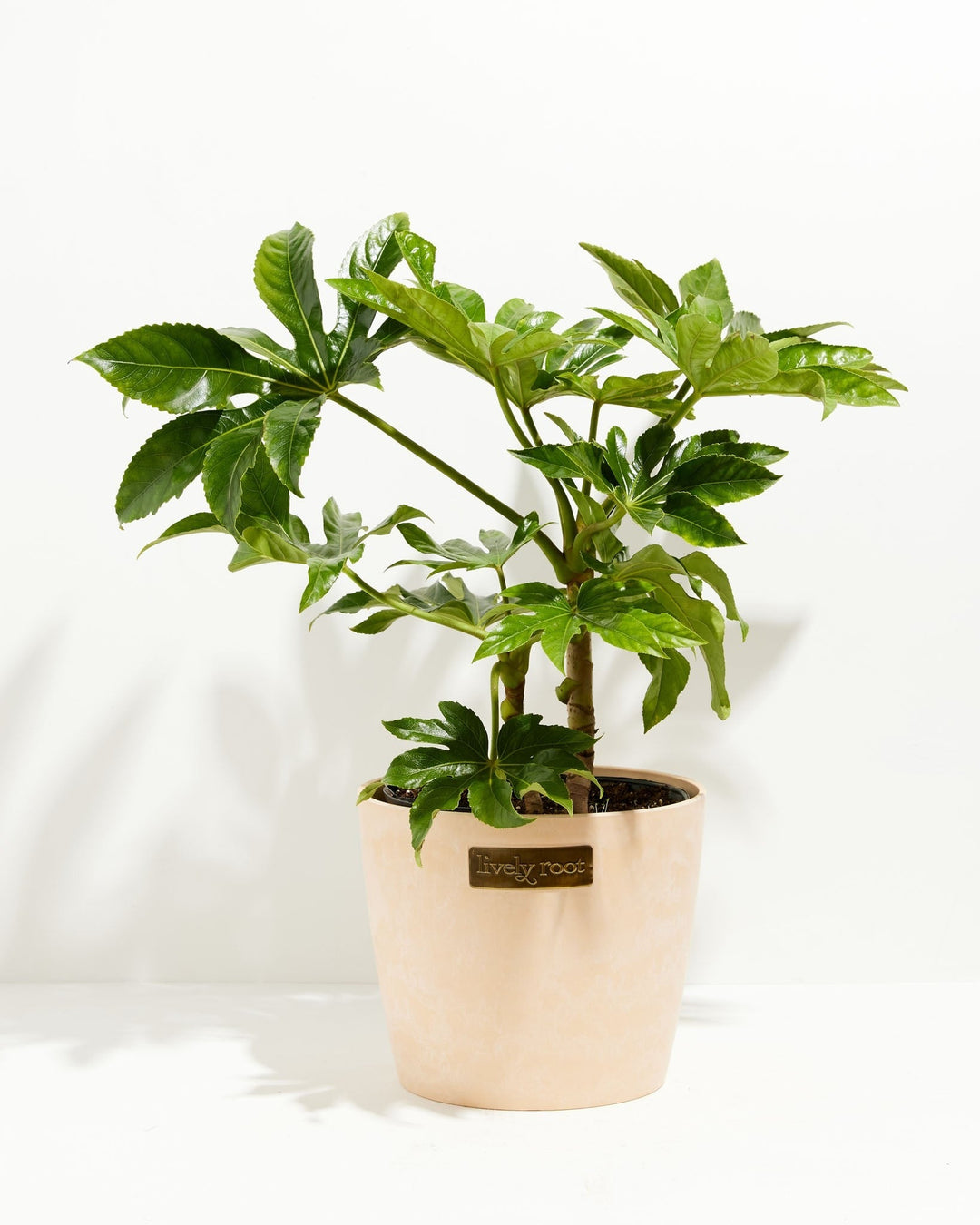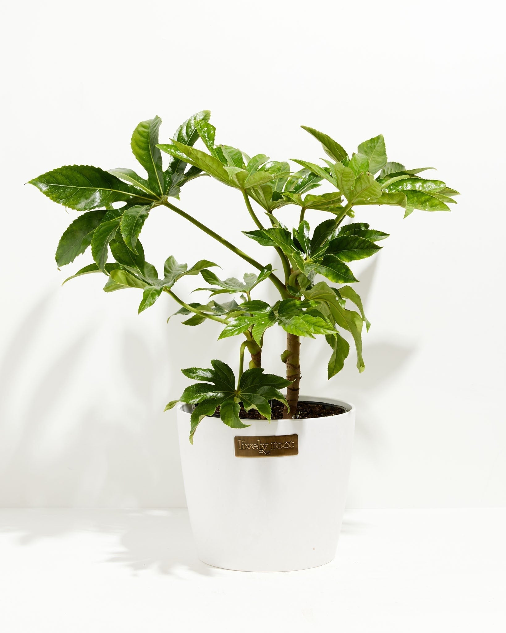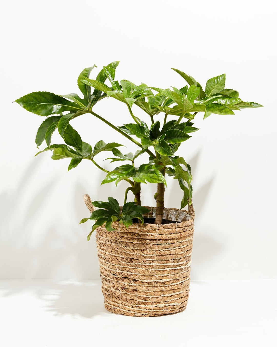 Add an ornamental touch to your home or garden with our Japanese aralia for delivery. This evergreen shrub has large hand-shaped leaves, which can often cause the plant to lean to one side. They prefer low light and can be planted outside in areas where winter temperatures stay above 5°F. If you care for them properly, they will reward you with flowers during winter.