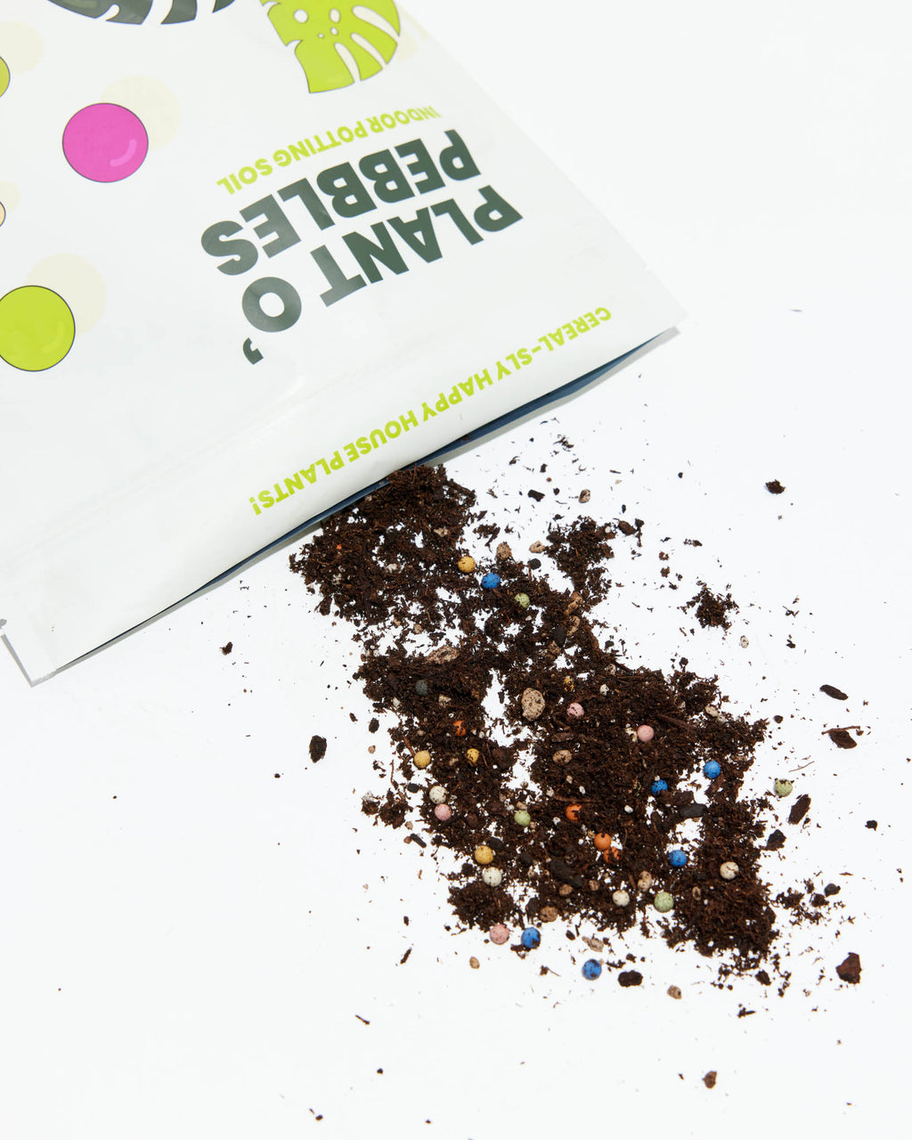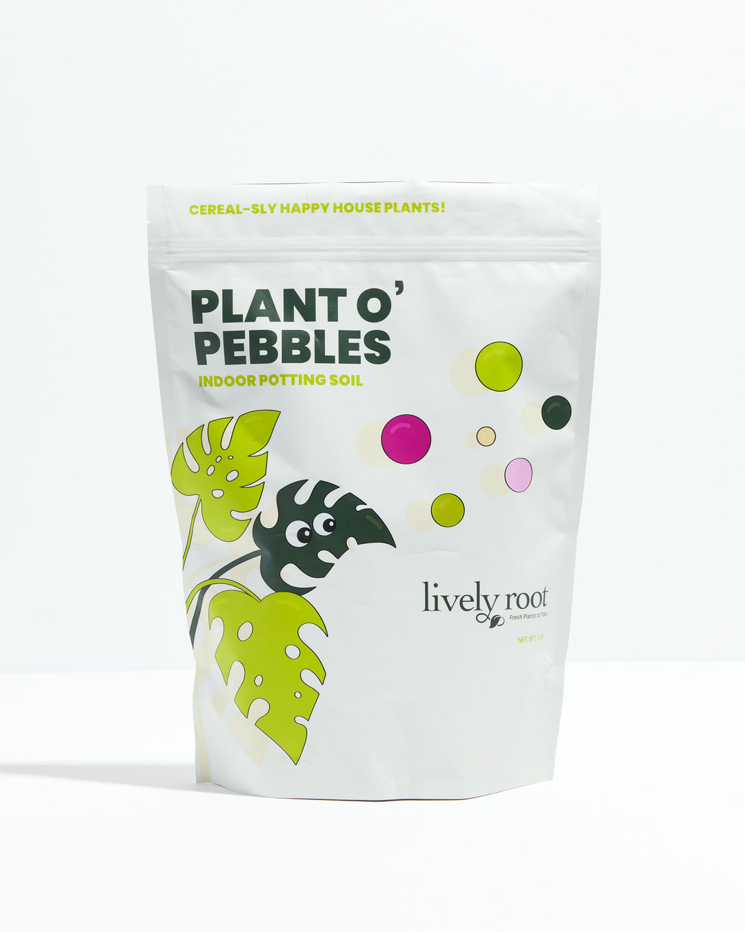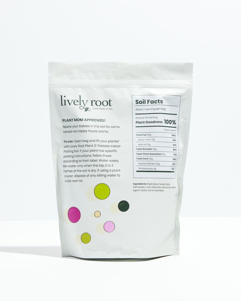 Here are the soil facts; your plants will be cereal-sly happy with this soil full of good vibes and fun. We've tucked little colorful surprises in with the hydro ceramisite balls. All ingredients help absorb nutrition, give more breathability around the roots, water absorption, and water retention. Give your plant instant-happy with this fresh sourced Lively Root Plant O' Pebbles soil!