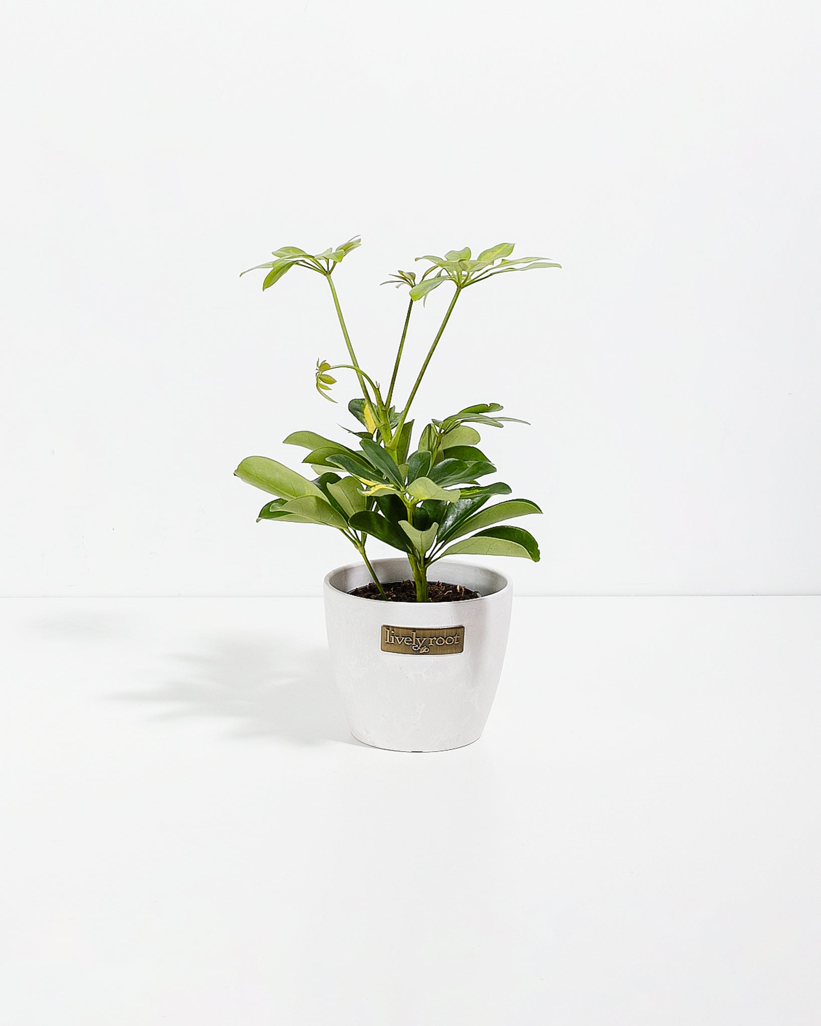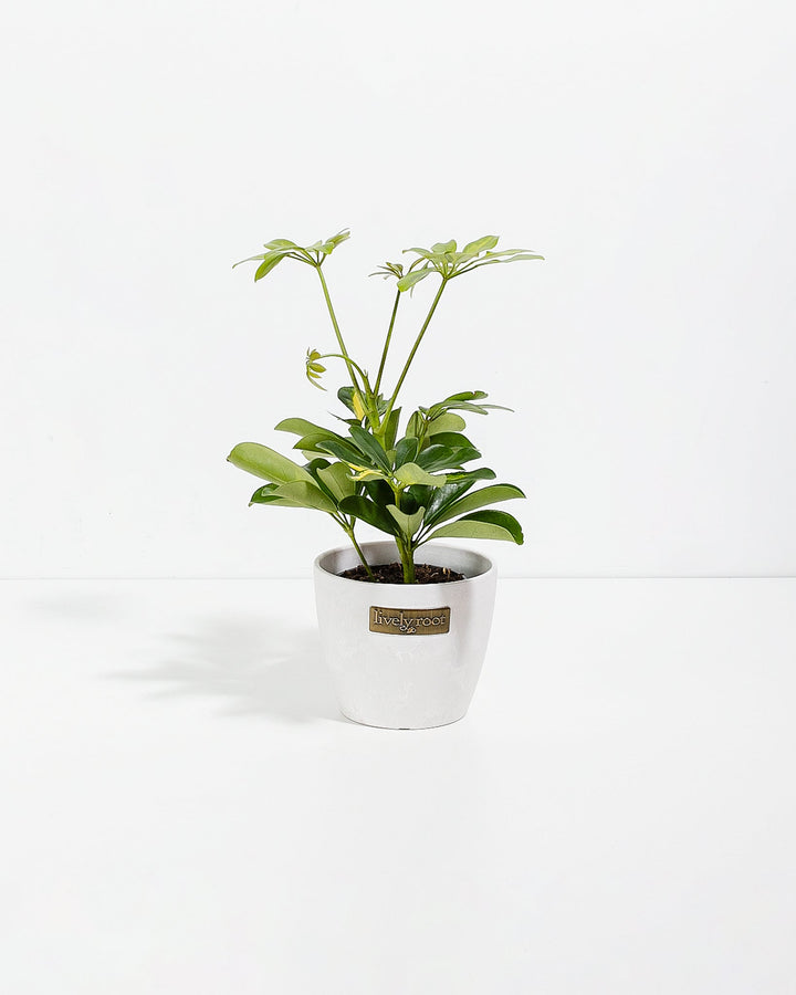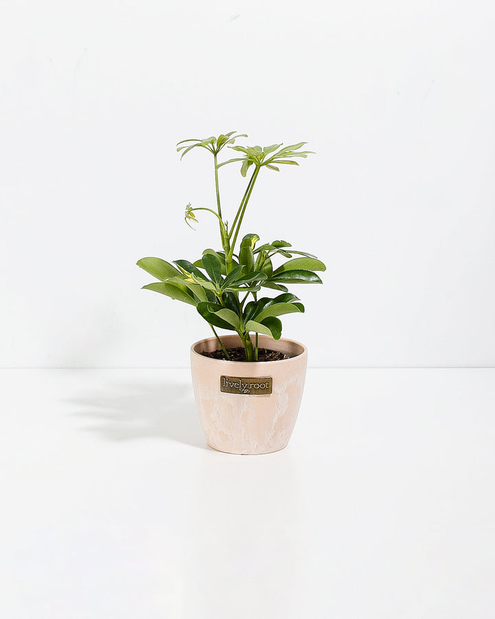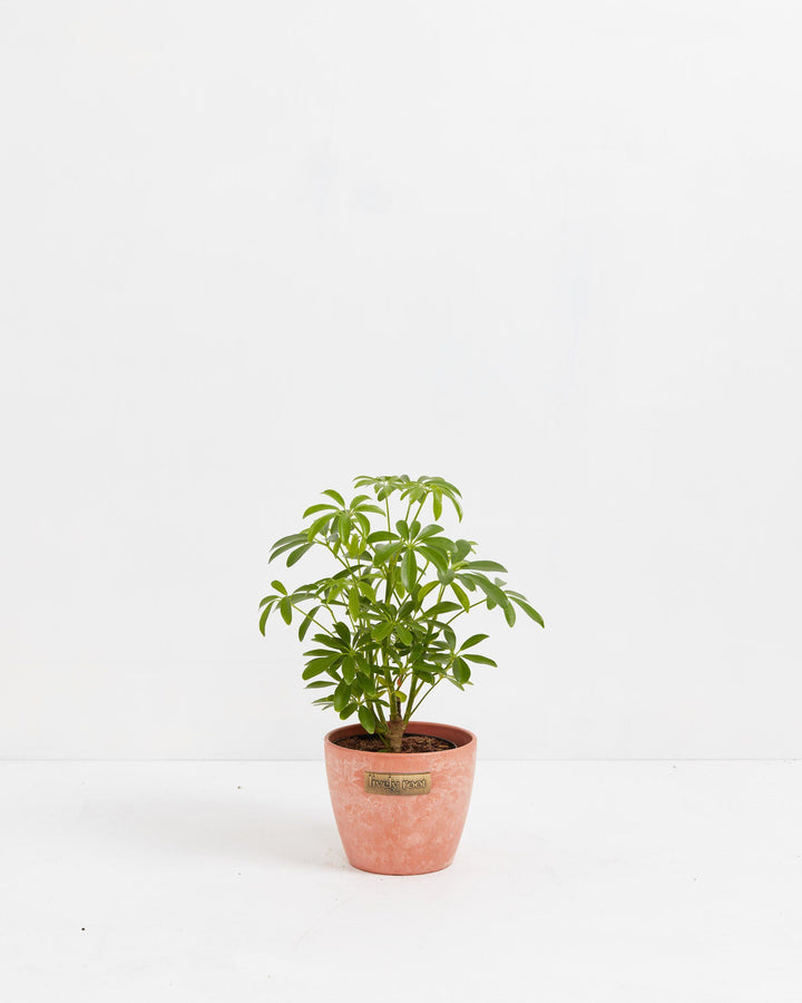 Enhance your indoor space with the elegant Schefflera Arboricola, also known as the Dwarf Umbrella Tree. This charming indoor tree earns its name from its unique leaf arrangement, which gracefully fans out in an umbrella-like pattern. This variety is perfectly suited for indoor environments, featuring smaller, compact leaves compared to its larger relatives. When housed in a smaller pot, it conveniently remains under 2 feet in height, making it an ideal choice for limited spaces.