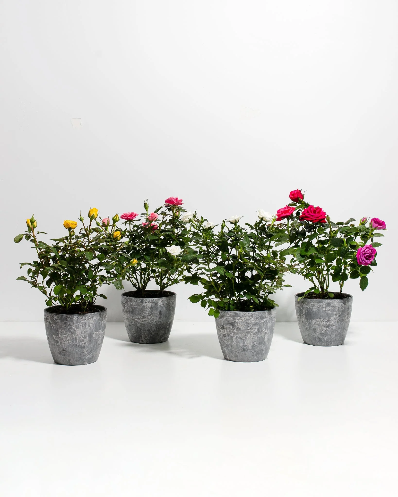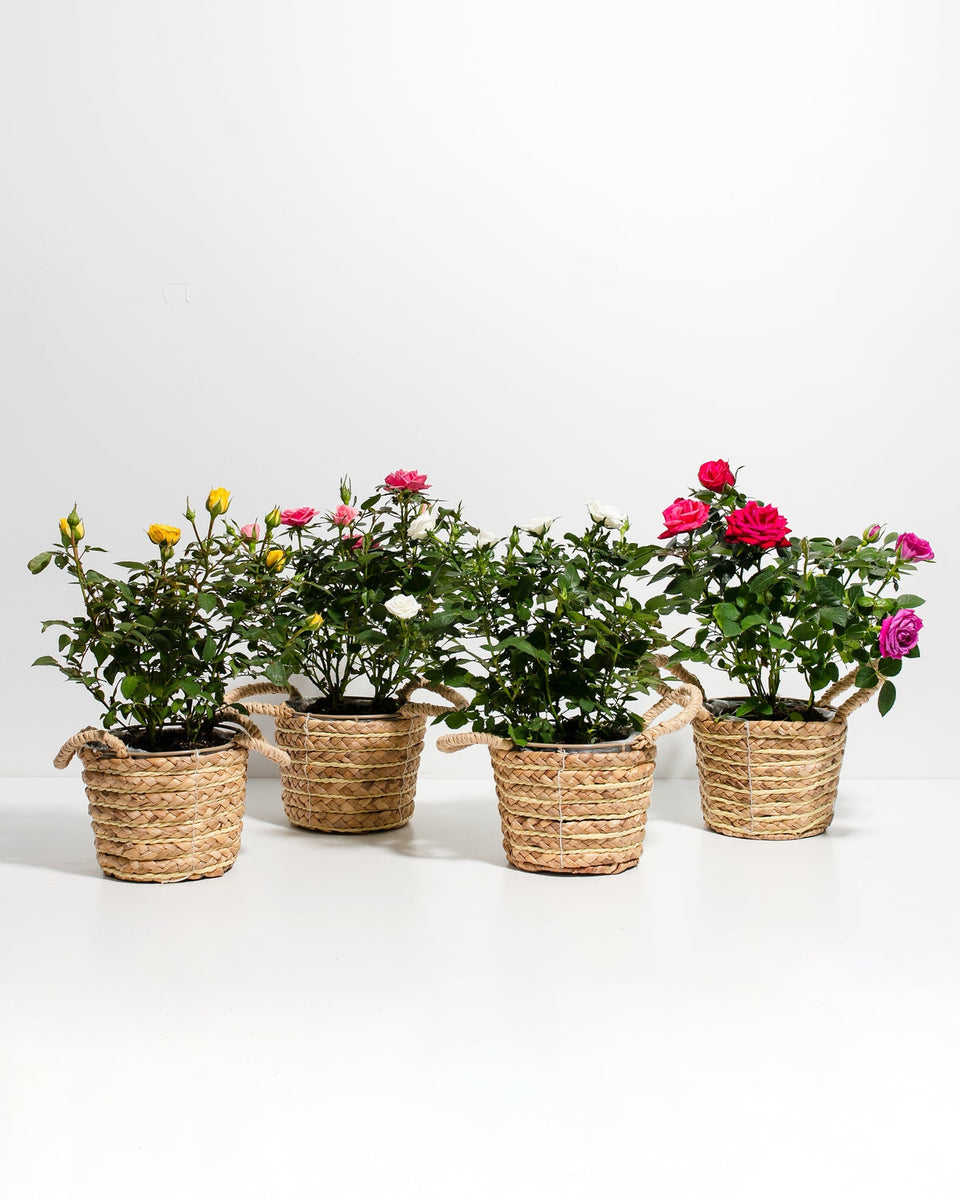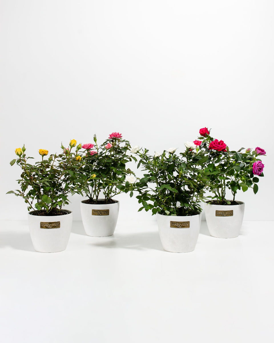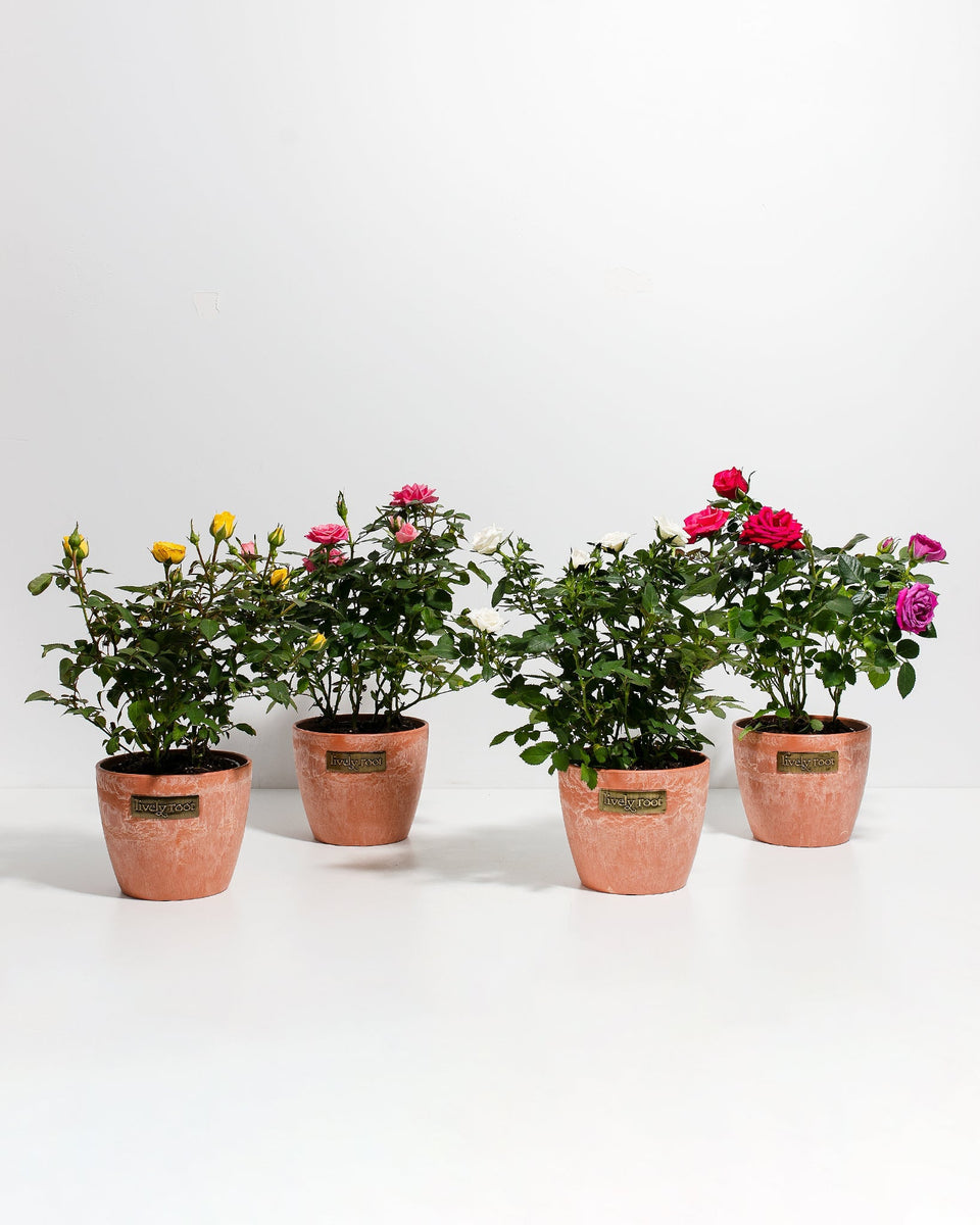 Can't decide which miniature roses are for you? Grab them all! This is a 4-pack of our best-selling miniature rose bushes. We'll send you four different colored roses straight from our nursery to your doorstep.