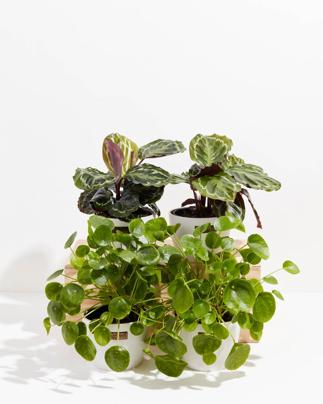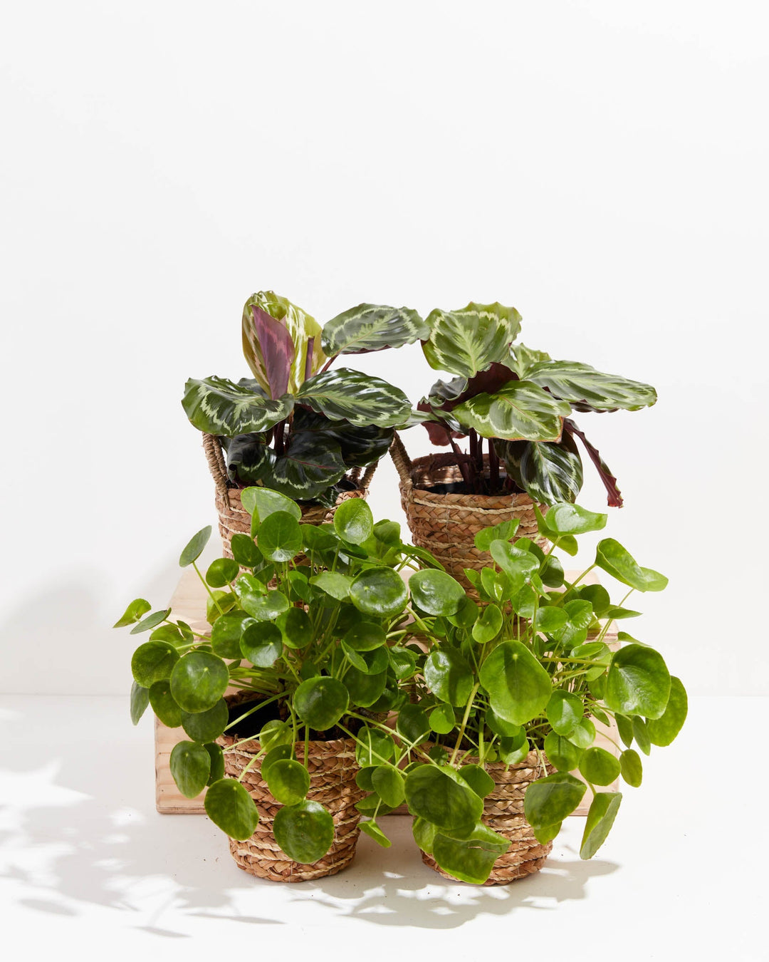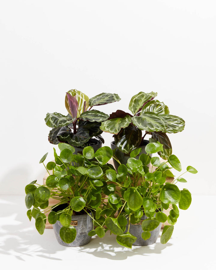 This collection includes two medium-sized Peacock Plants two medium-sized Chinese Money Plants.