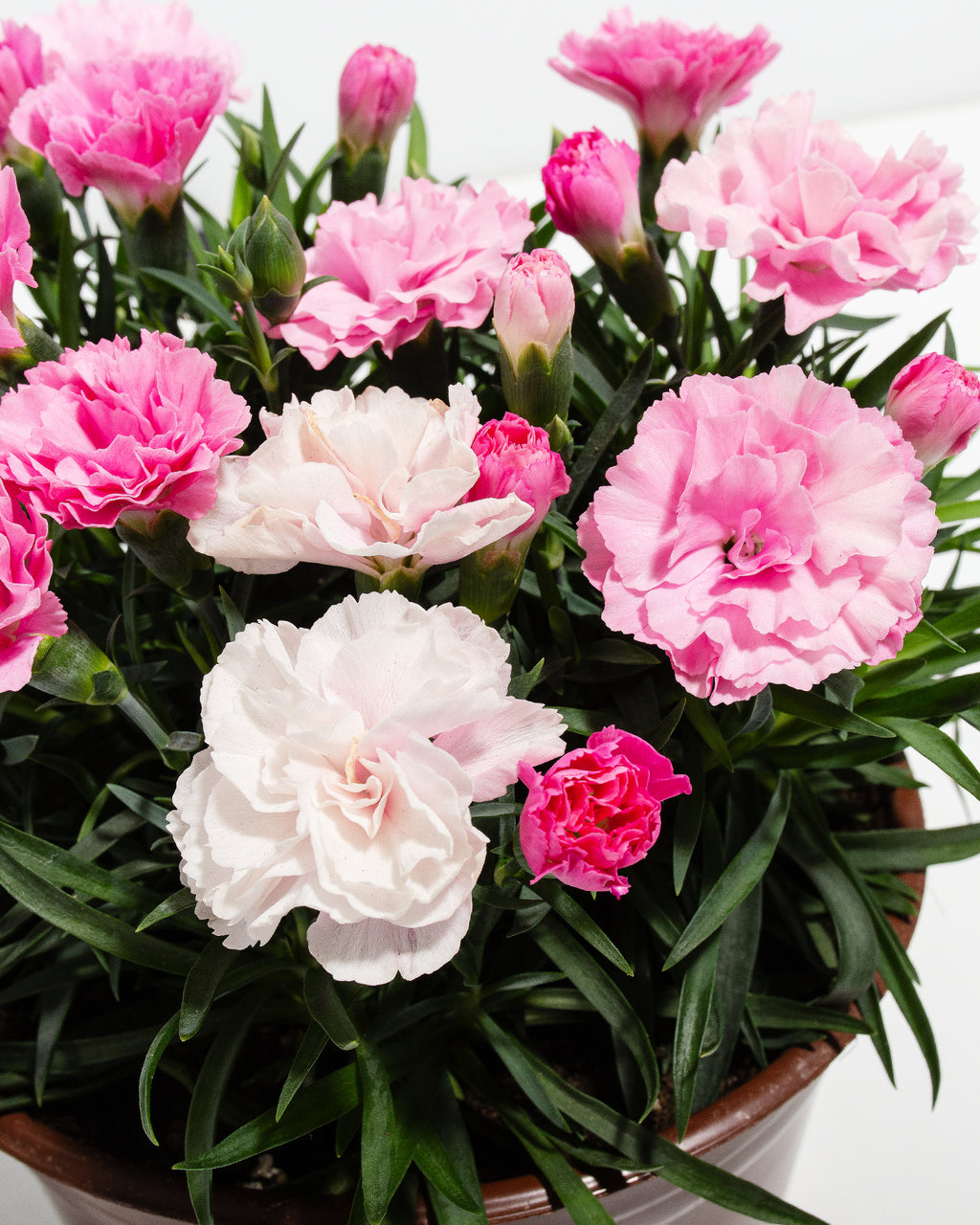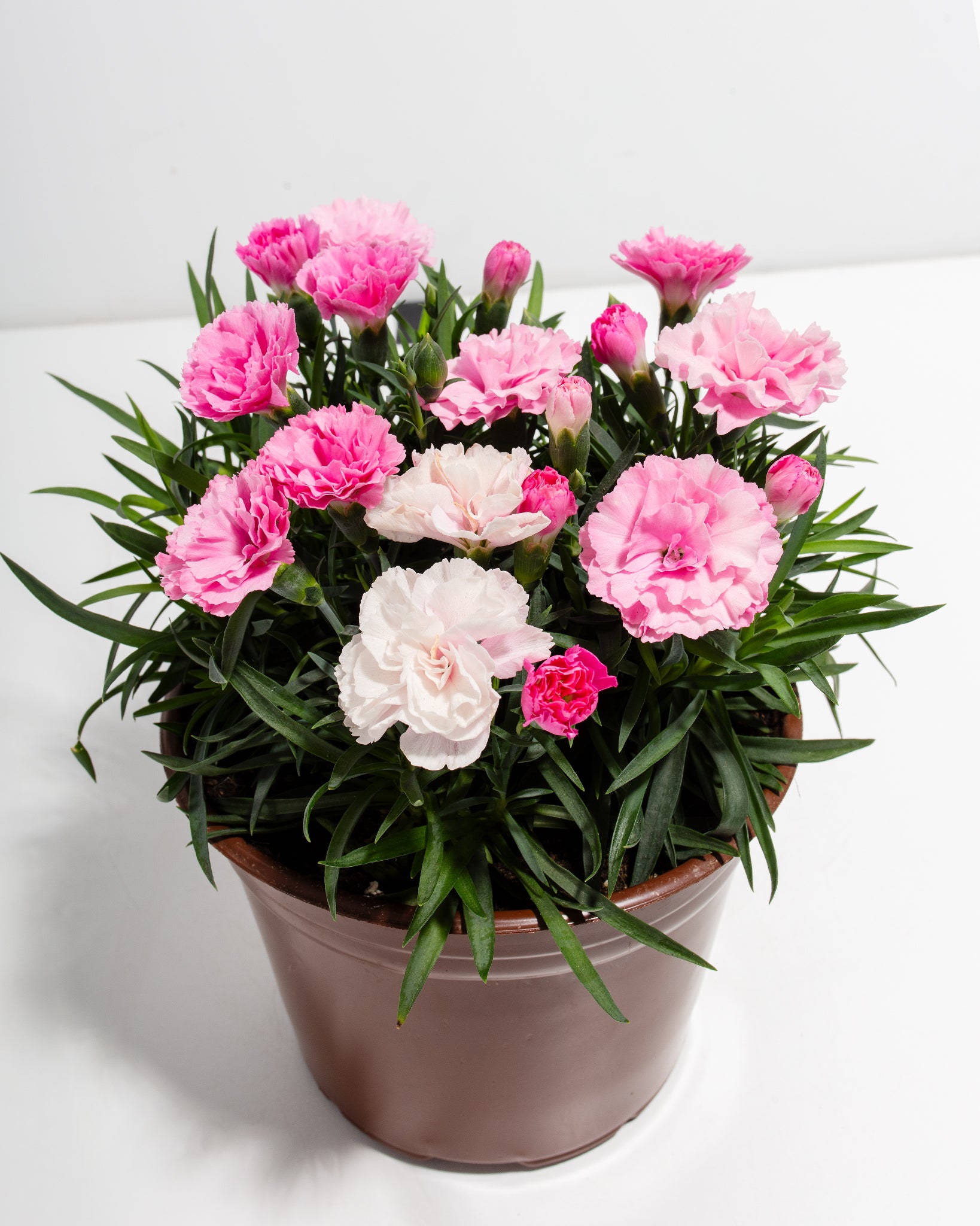 Repot young pink carnation plants annually in the spring into slightly larger pots. For established plants, repot every 2-3 years. You can propagate carnations by taking stem cuttings. Select healthy stems with several nodes. Cut the stems below a node, remove the lower leaves, and dip the cut end in rooting hormone. Plant the cutting in a pot filled with a well-draining potting mix and keep it moist. Place the pot in a warm, bright location with indirect light. The cutting should root in 2-4 weeks.