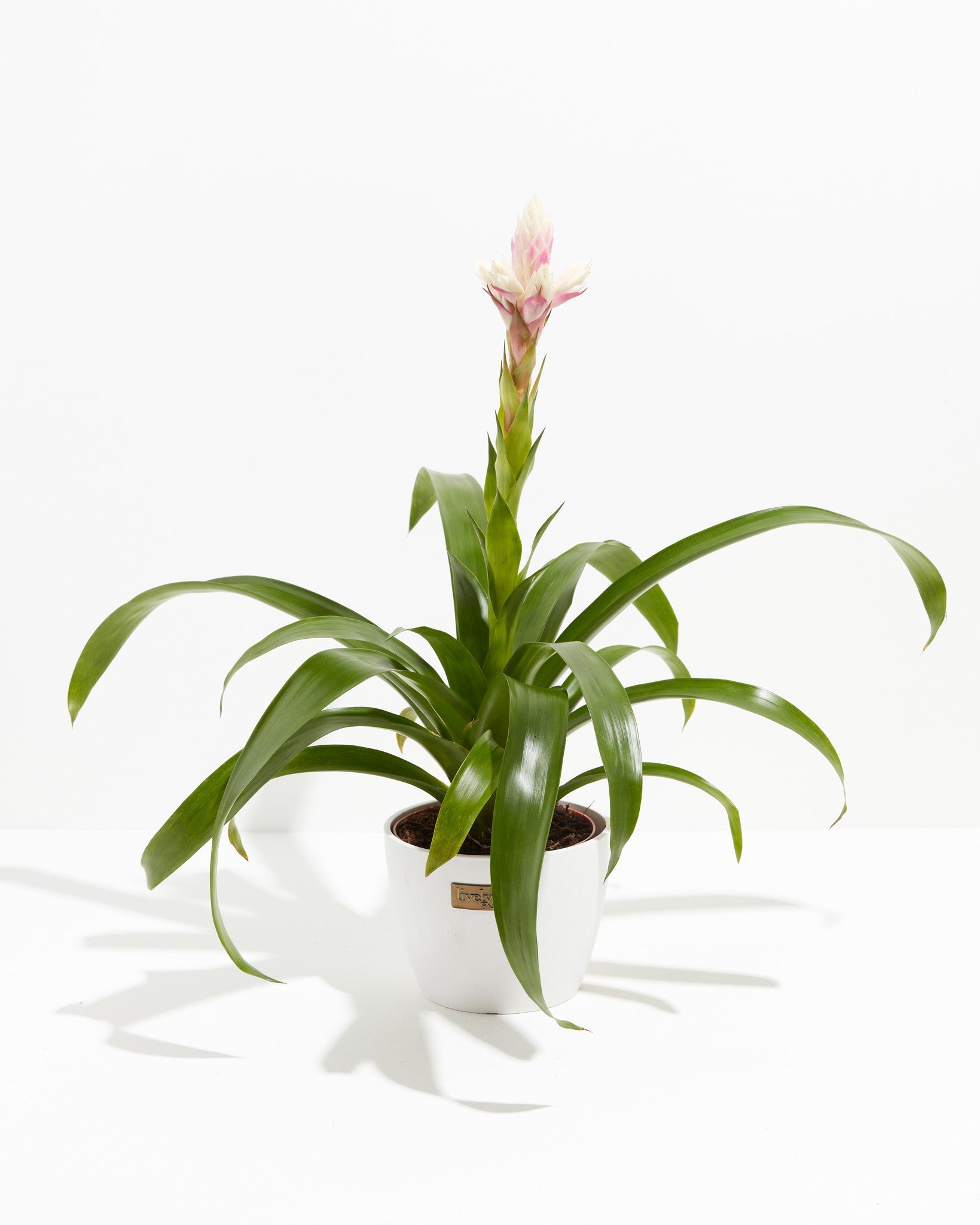 'Priscilla' Guzmania Bromeliads add significant intrigue, color, and beauty to your Green Space. They have long, slender evergreen leaves topped by a single brilliant inflorescence of tongue-like petals. The bloom will be white and pink, sometimes a lot pinker than in this photo!