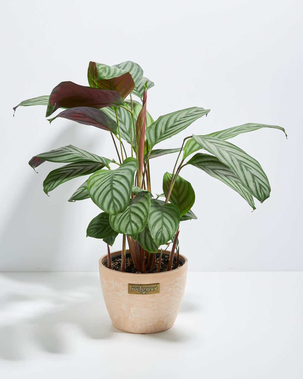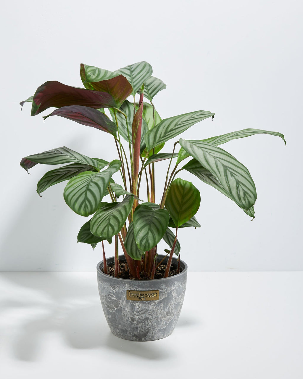 Setosa 'Grey Star' (Ctenanthe setosa) is part of the Marantaceae family giving her the ability to respond to the circadian rhythmic nastic movement at the onset of darkness. You'll see her long elliptical leaves fold upward as if in intense prayer. The undersides of her leaves are painted in a deep purple giving her a whole different shape and look at night. It's like she's changed into a new dress for the evening and gone to her prayer closet. Give her room to expand to get to 3 feet tall and wide in the right conditions.