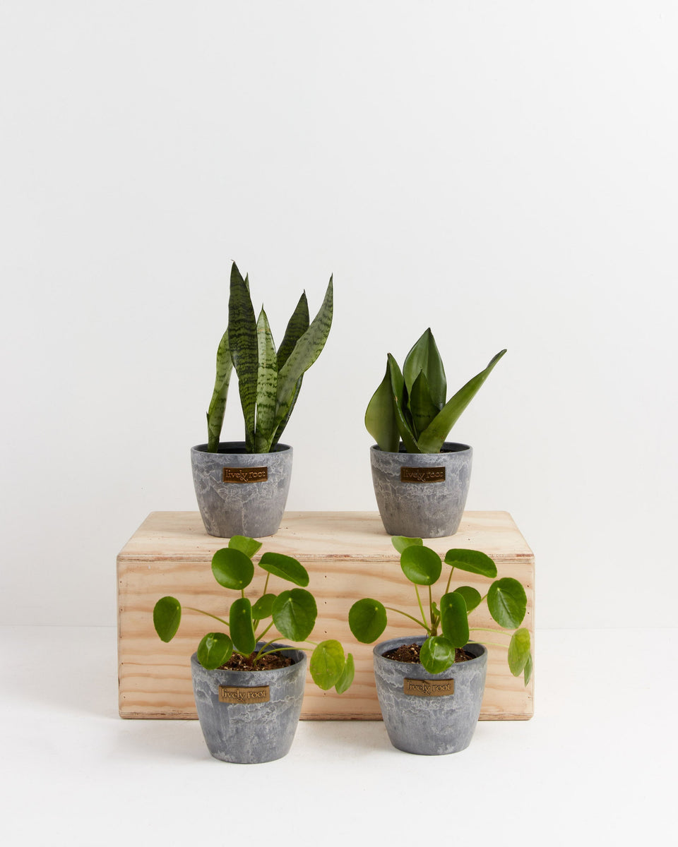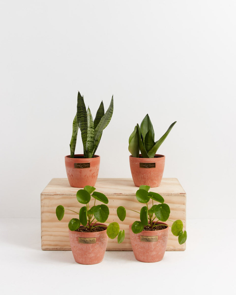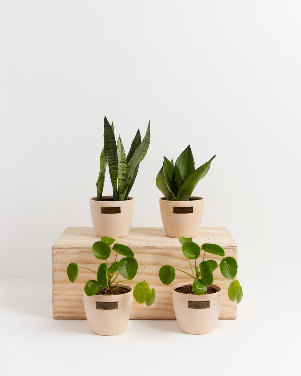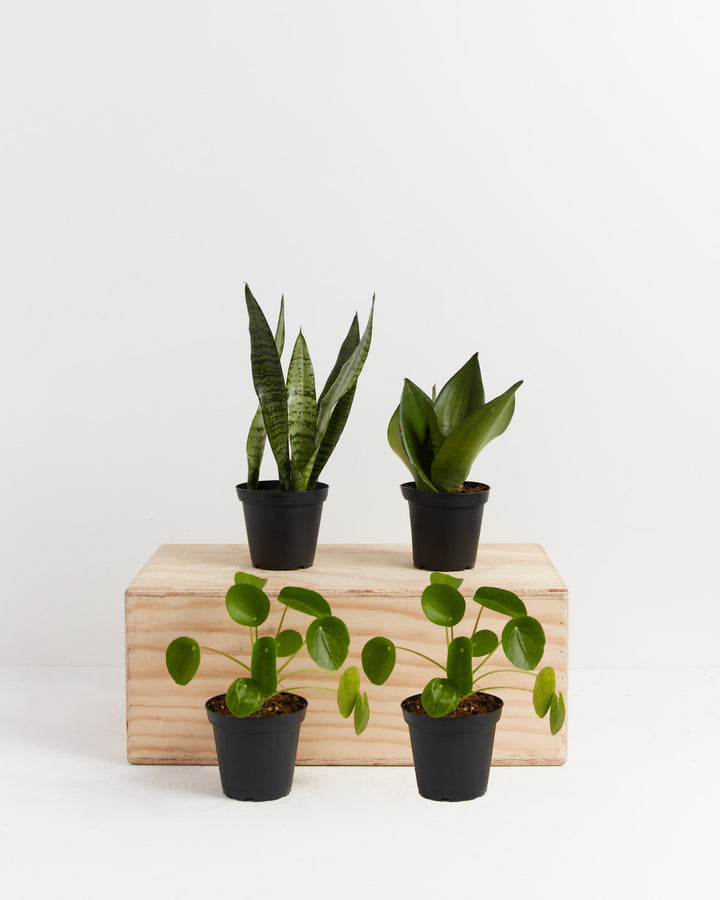 Add some greenery to your home with this beautiful bundle. It combines two of our favorite low-maintenance plants. They're both easy to care for, but the similarities end there. The money plant, which is thought to bring good fortune, has thin stalks with big round leaves. Meanwhile, the snake plant, which symbolizes growth, has sharp variegated spears. You get two of each — keep them together for a striking contrast.