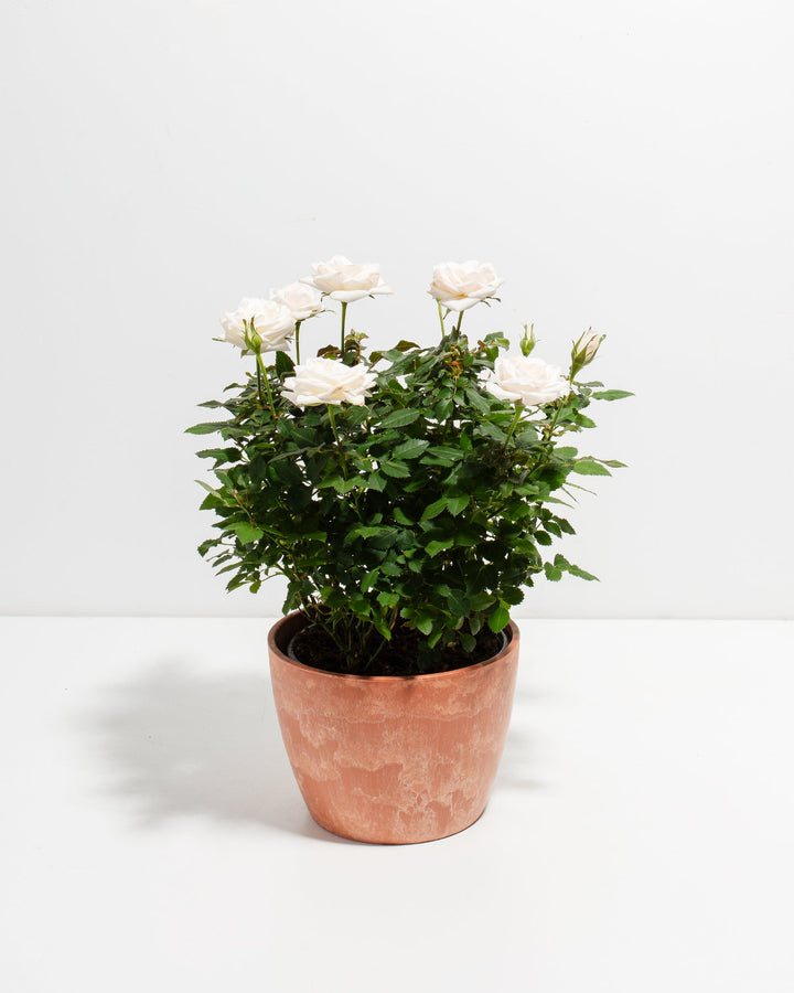 Snow White Miniature Roses (Rosa chinensis minima) boast a delicate fragrance and blooms in flushes during the growing season. The bloom size is about 1 1/2 inches wide with gorgeous white petals. These charming miniature roses will give you joy from late April to September, so get your cameras ready! The green foliage makes a nice collar effect to the double-flowered cultivar we call Rosie! Expect her to top out at 12-18 inches tall.