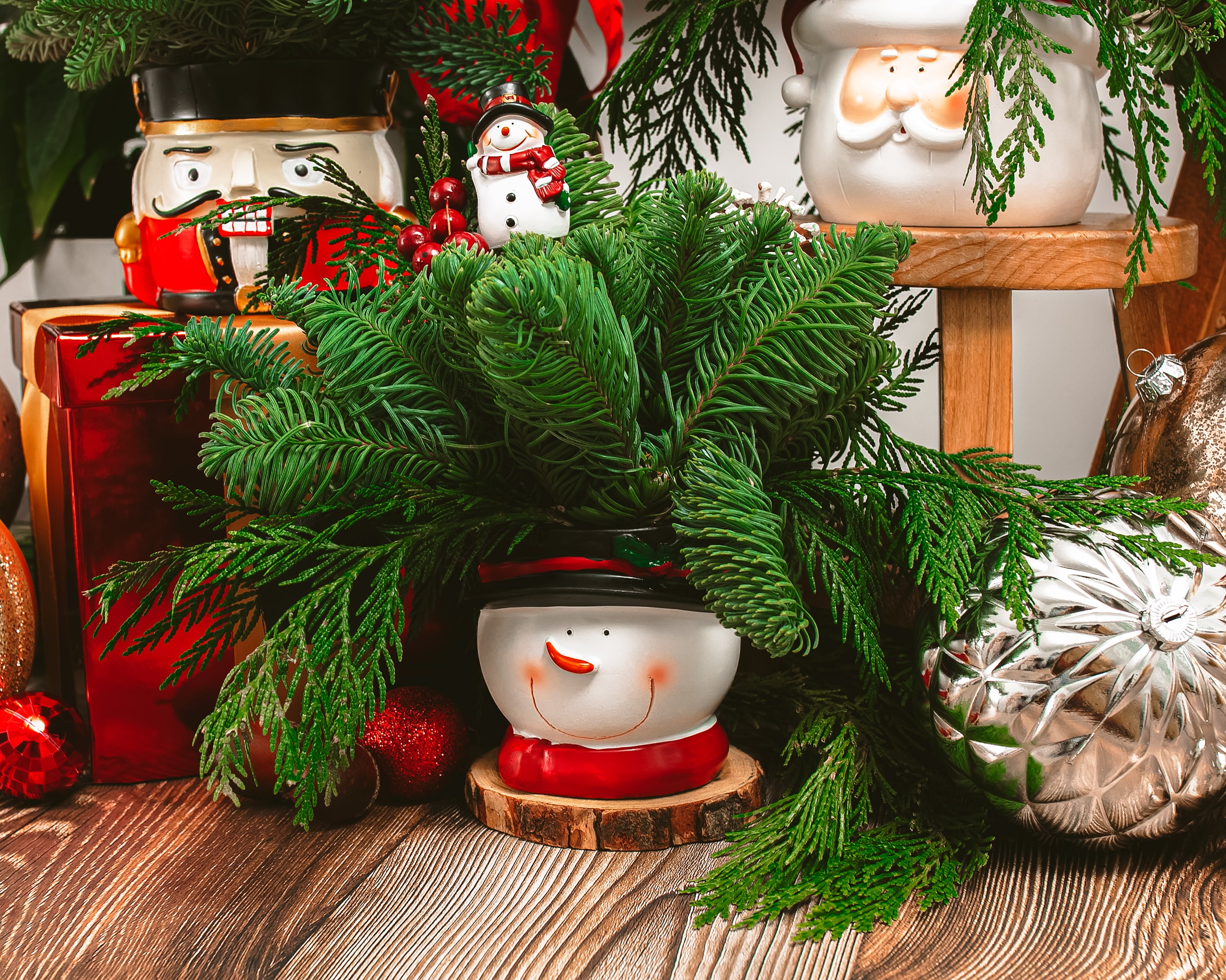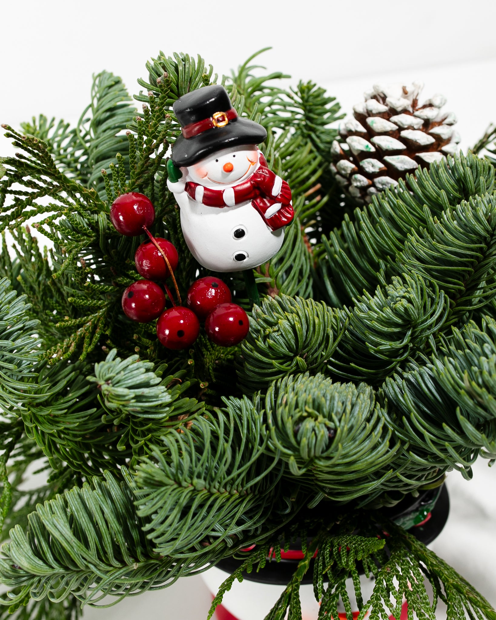 Let your holiday decor be as lively as your holiday spirit this season with this ~chill~ centerpiece. The arrangement displays fresh-cut pine and cedar, straight from the Pacific Northwest, elegantly put together in a classic snowman pot. This centerpiece is a perfect table decoration and makes for a unique gift too! Give it a sprits of water every few days and you'll have green leaves for up to 6 weeks!