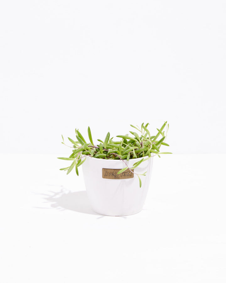 Fast draining succulent or cactus potting mix is an excellent choice to use for this succulent. Choose a high enough pot or hanging basket so the plant's tendrils can hang over the pot or basket. Only enlarge the container by one pot size. To prepare for the transfer and secure the tender tendrils, gently drape them onto the top of the soil. To avoid backfilling, work the soil up the container pot's side before placing the plant inside. If possible, to avoid breaking any tendrils, cut the grower pot down one side and gently pull the container apart to lift out the root system. Next, sit the root system into the new pot and add extra soil around the sides, leaving no air bubbles and pack down tightly. Gently unfold the string of rubies stems down the sides of the pot all the way around to hang correctly. Water well and allow a month before fertilizing.
