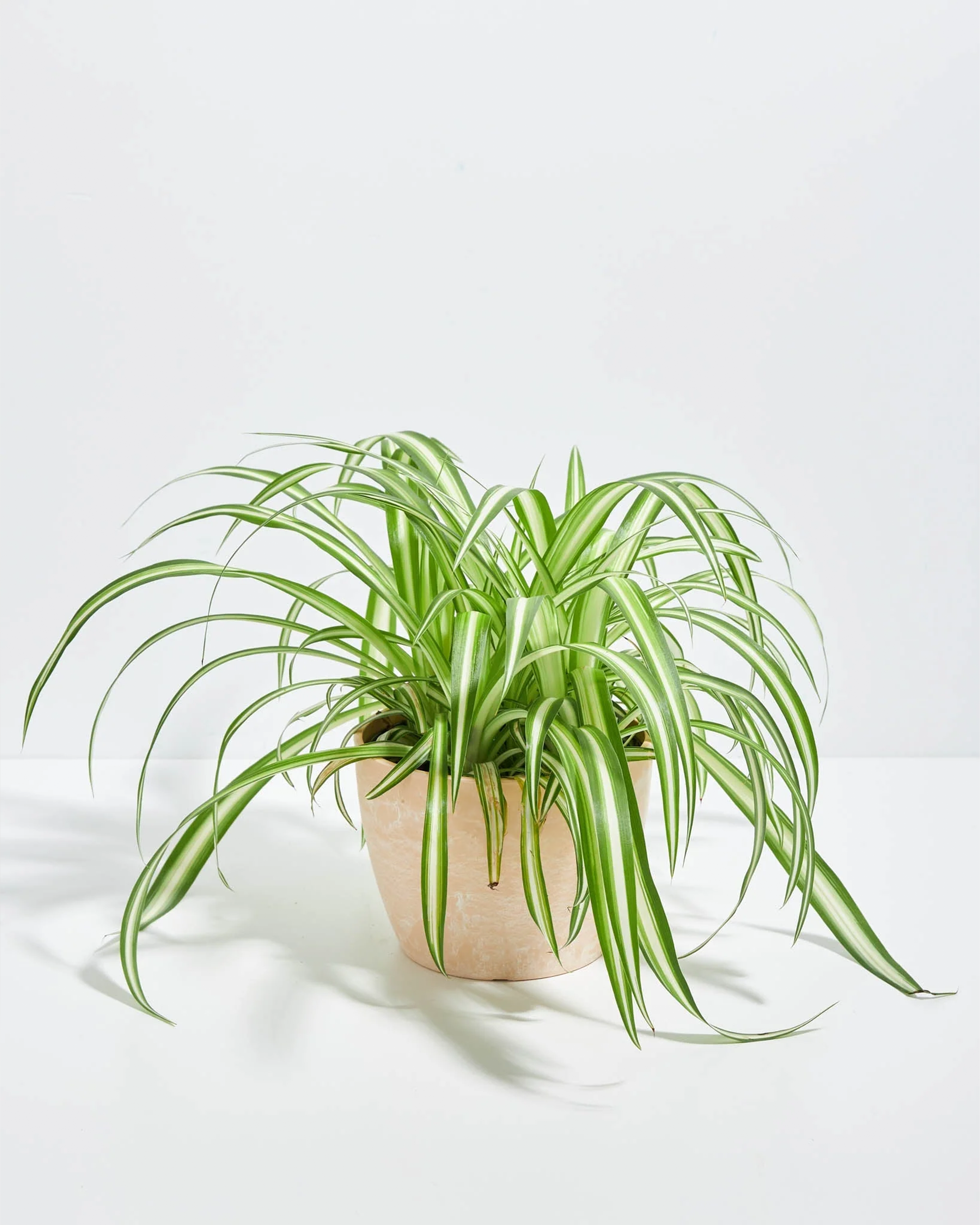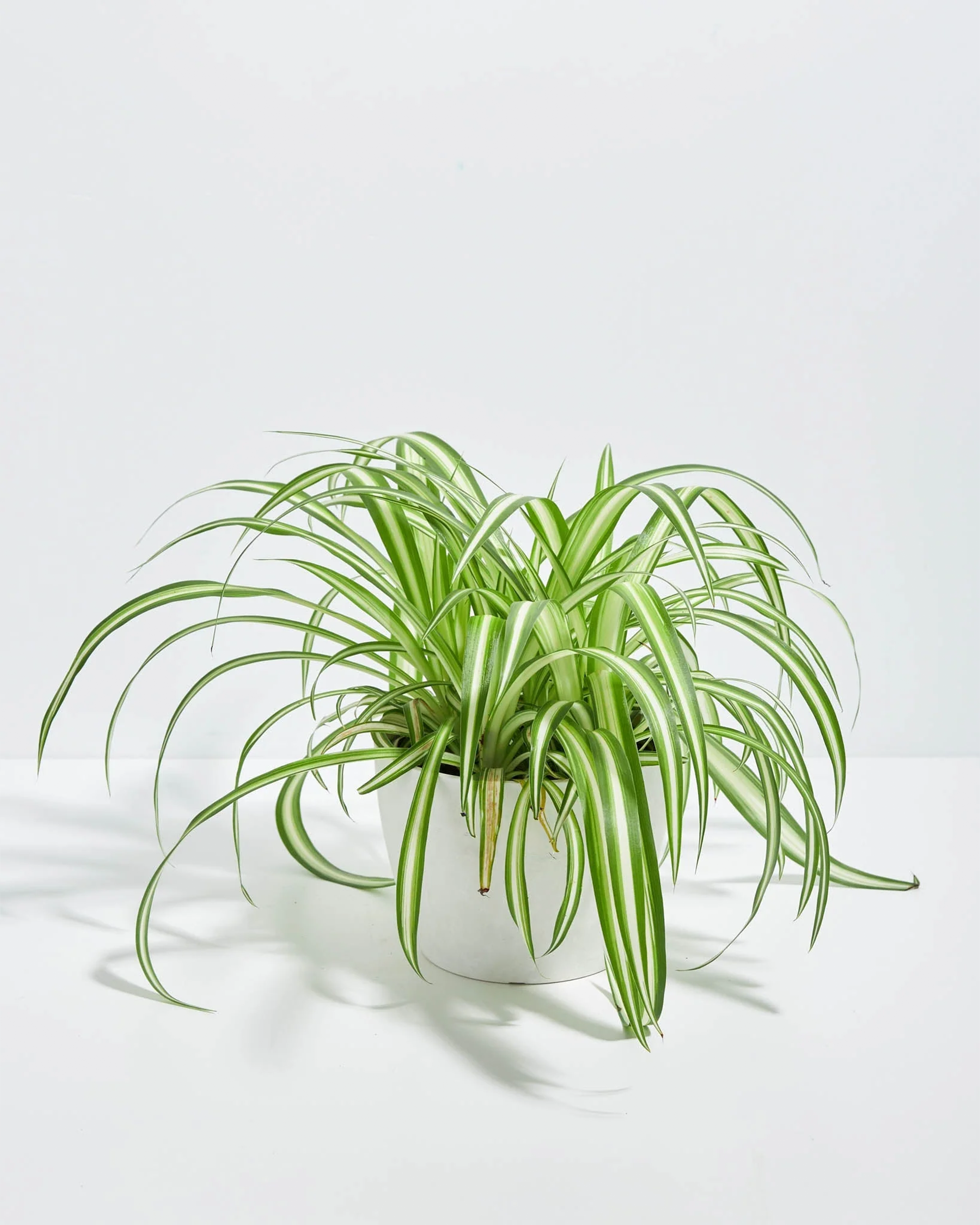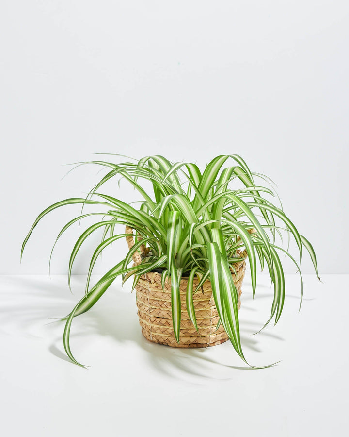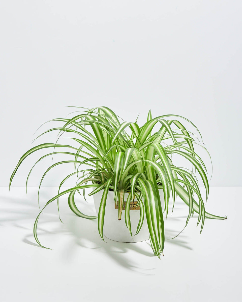 The traditional variegated spider plant features lime green stripes on the outer edges and a white stripe in the middle, unlike the Reverse Spider Plant. These beauties are pet-safe, perfect for households with curious furry friends.